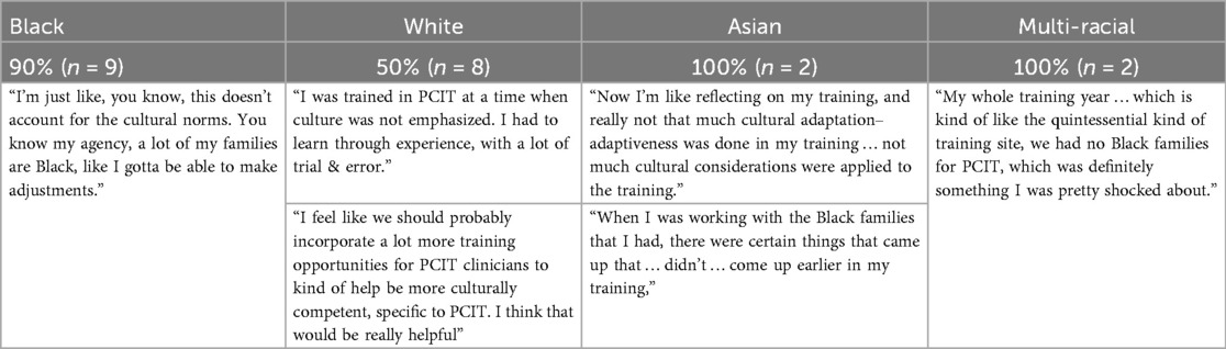 While there was a general consensus regarding the high quality of core PCIT training, clinicians reported commonly feeling that the trainings lacked sufficient attention to culture and PCIT's tailored application to working with Black families (See Table 4). Such sentiments were endorsed by 100% of Asian and Multi-racial clinicians, 90% of Black clinicians, and 50% of White clinicians. Some clinicians discussed that issues of culture were not addressed at all, and felt that PCIT trainings should include some cultural competency training specific to PCIT. Accordingly, there was a feeling that the emphasis on treatment fidelity overshadowed taking time to address areas where the model did not seem to be a good fit for the cultural populations that clinicians served at their agencies. Relatedly, others marveled at the limited availability of Black families to work with in their training.
