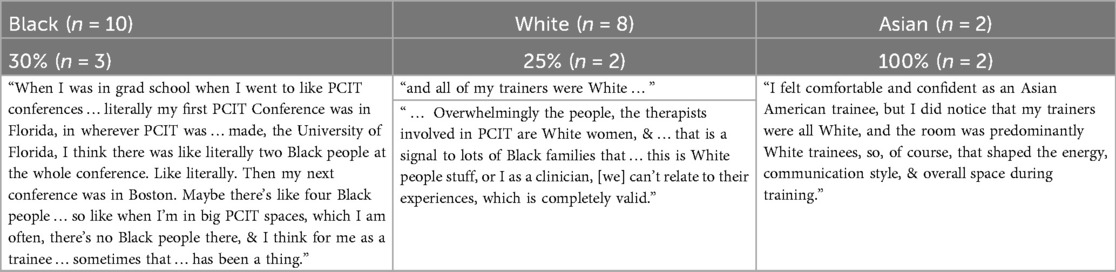 Among Black, White, & Asian Clinicians, there was a shared sentiment that within PCIT learning communities, such as conferences or trainings, there was a cultivated climate of “Whiteness.” For clinicians of color, this climate illuminated their “otherness” and negatively impacted their training experiences (see Table 5).