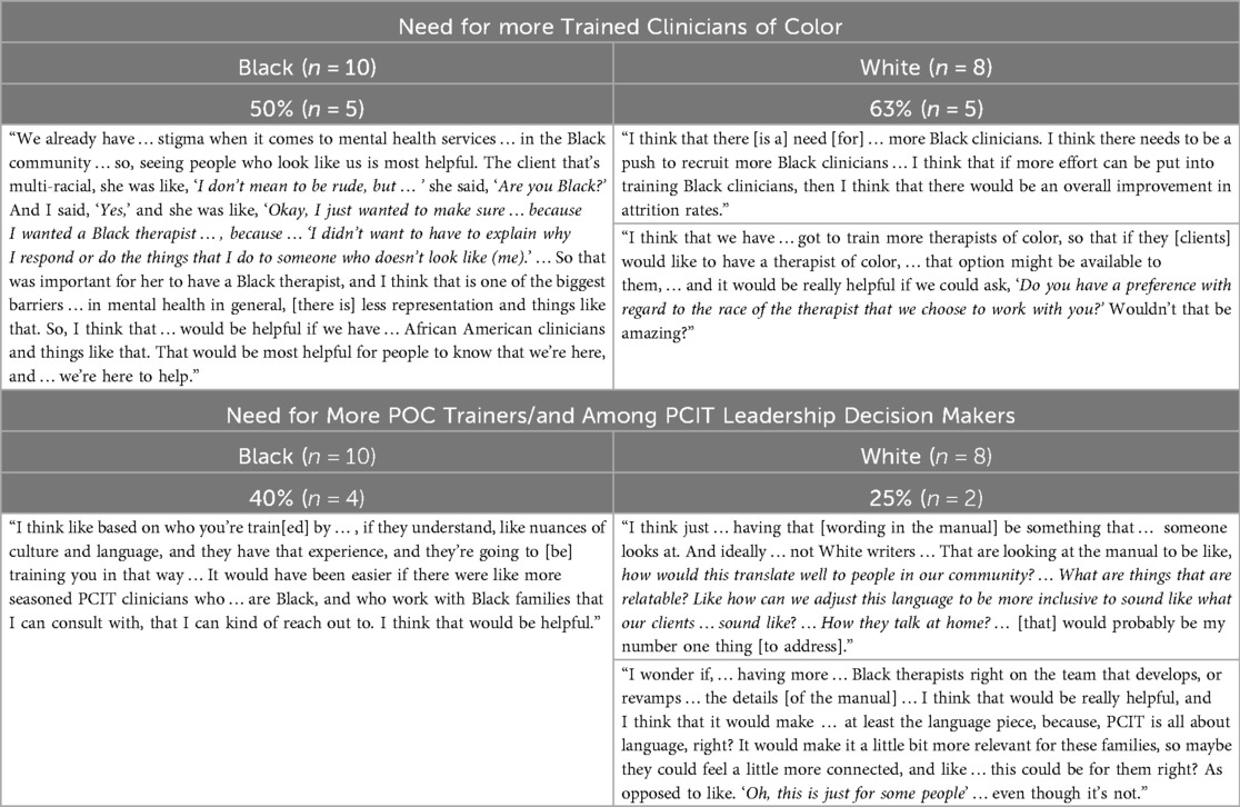 Such viewpoints were also communicated through Black and White clinicians' desires for a more visibly diverse representation of PCIT clinicians, trainers, and decision makers. Both Black and White clinicians identified the need for increasing the number of trained providers of color (Black Clinicians = 50%; White Clinicians = 63%), and those who hold higher level positions in the PCIT organization, such as trainers and decision makers (Black Clinicians = 40%; White Clinicians = 25%; See Table 6). The call for an increase in Black PCIT clinicians, emerged at a slightly higher rate for White clinicians, compared to Black clinicians. However, the reverse was true regarding the call for greater Black representation among trainers and the PCIT community leadership. Instead, this sub-theme emerged at almost double the rate for Black clinicians, as compared to their White counterparts (see Table 6).