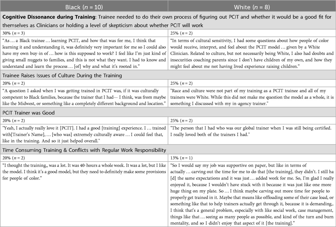 There were four areas that received lower rates of endorsement by Black and White clinicians during their training. First, they reporting having some skepticism regarding whether PCIT would work (Black = 30%; White = 25%). The nature of the quotes included needing additional time to do their own processing to figure out if PCIT would be a good fit for themselves as clinicians. Second, Black and White clinicians reported raising issues of culture during the training (Black = 20%; White = 25%) in the context of the PCIT model. Third, a few Black and White clinicians reported feeling that the training was too time consuming (Black = 20%; White = 13%). Trainees reported conflicts with their regular work responsibilities, and struggling with taking time off to train. Last, while there were significantly favorable appraisals of the overall core PCIT training (as referenced above), a few Black and White clinicians also made reference to a favorable appraisal of their specific PCIT trainers being good (Black = 20%; White = 25%); See Table 7).