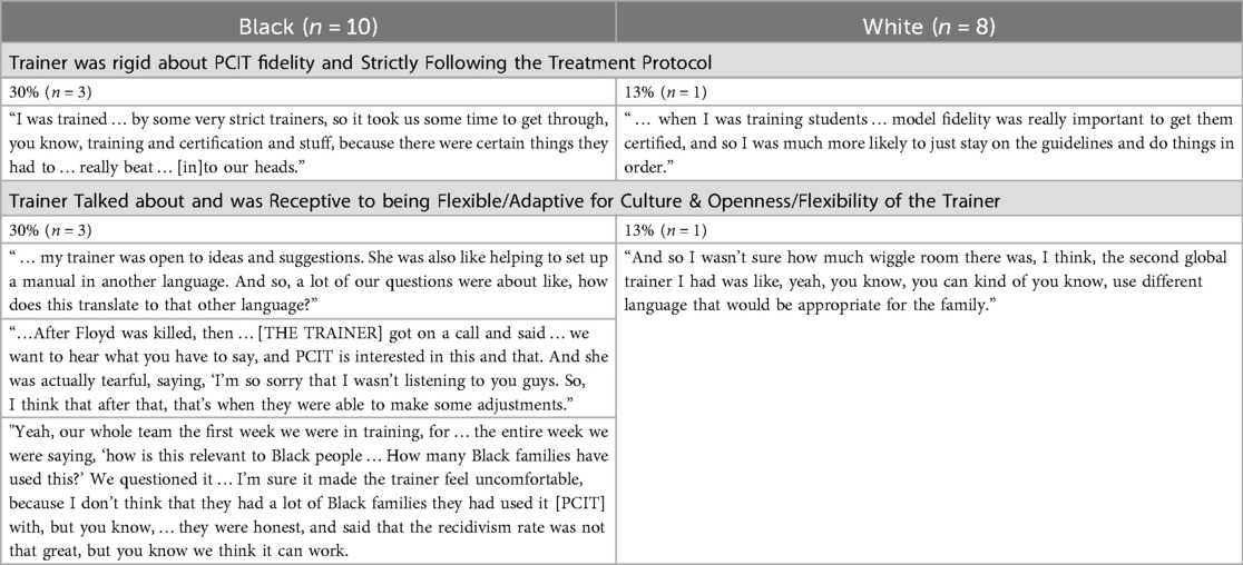 Similarly, in matters related to PCIT Trainers, there were other lower mutually endorsed trainer items that emerged for both Black and White clinicians (See Table 8). However, Black clinicians tended to have higher rates of endorsement compared to their White counterparts across the Trainer domain areas in a 3 (30%/n = 3) to 1 (13%/n = 1) ratio. Those Trainer domain areas included perceptions of the trainer's rigidity in strictly following the protocol, while other clinicians cited experiences of their trainer's openness to discussing cultural issues in PCIT, and demonstrating a willingness to explore cultural adaptations.