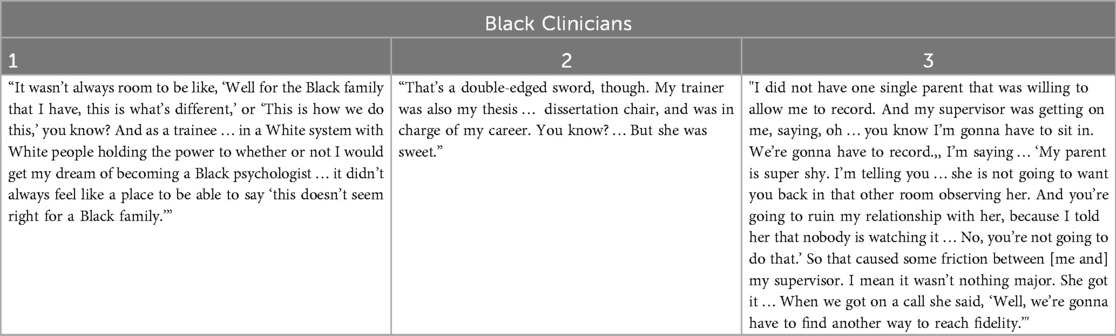 Consistent with Black Clinicians' sense of cultural competency in working with Black families, one clinician reported leveraging their cultural competency to build a strong level of trust with their Black clientele that enabled them to become certified before several others in their White training cohort.