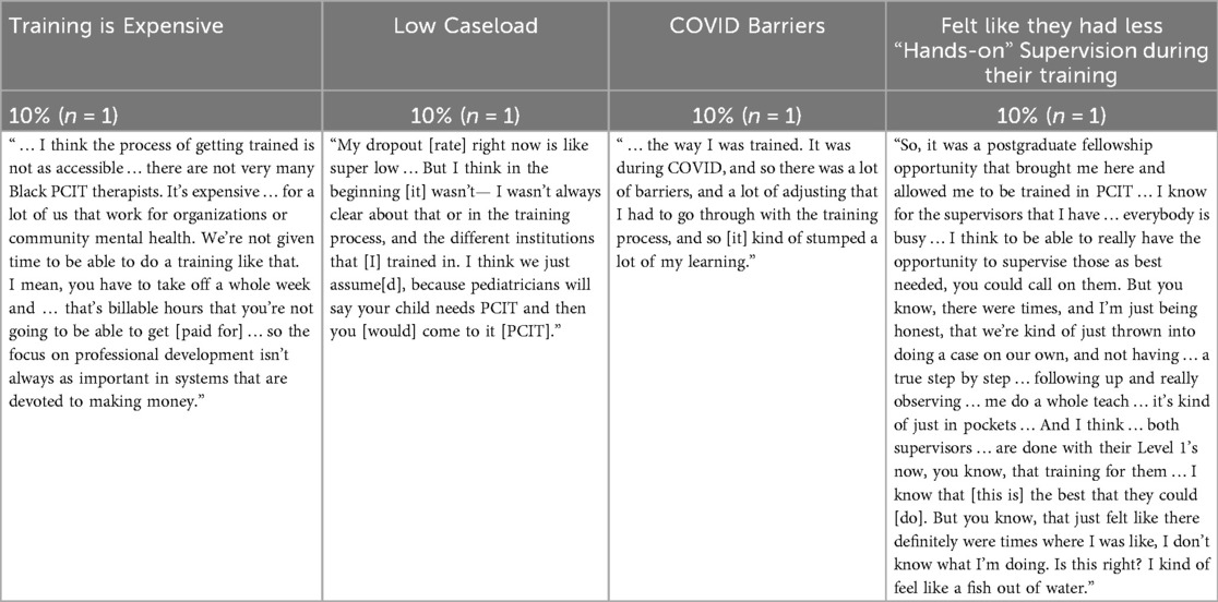 Forty percent of Black clinicians also remarked about instances when their training, although good, was less than ideal due to a myriad of barriers including: (1) prohibitive costs of training (10%), (2) challenges in securing a PCIT caseload, (3) challenges of managing trainings during COVID-19 disruptions (10%), (4) desires for additional supervision (10%) (See Table 11).