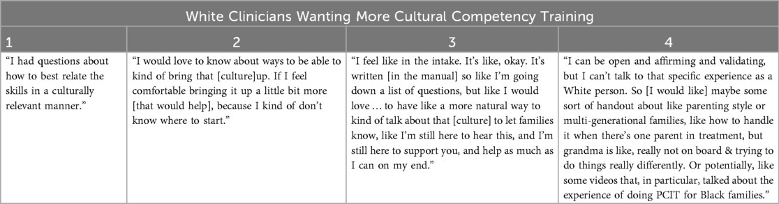 Table 4. Quotes depicting clinicians' feelings that PCIT trainings lacked attention to cultural issues.
