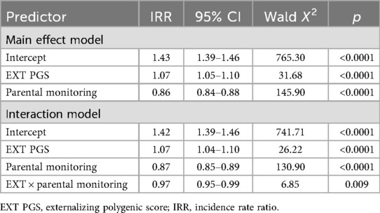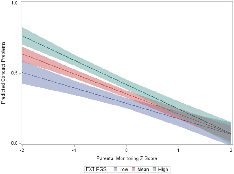 A generalized linear model was fit using PROC GENMOD and the full analytic sample. A Poisson distribution was used to model CPs due to skewness, but not overdispersion, of the count variable. The summed CP score was regressed on EXT PGS, parental monitoring, and an EXT PGS × parental monitoring interaction term. Covariates (top 10 ancestry principal components, age, and sex) were residualized on the EXT PGS before including it in the interaction.