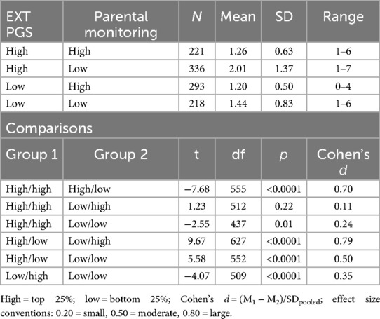 The analyses were conducted using SAS version 9.4. To generate descriptive statistics, “risk groups” were generated by classifying the sample into groups based on the combined level of EXT PGS and parental monitoring. PROC RANK was used to create quantiles for each variable, which were subsequently used in combination to create the following groups based on EXT PGS (low vs. high genetic risk) and parental monitoring (low vs. high parental monitoring): high–high, high–low, low–high, and low–low. Descriptive statistics for each of these groups were generated, and means were compared among the groups using t-tests. Effect sizes, as indexed by Cohen's d, were also calculated for each group difference.