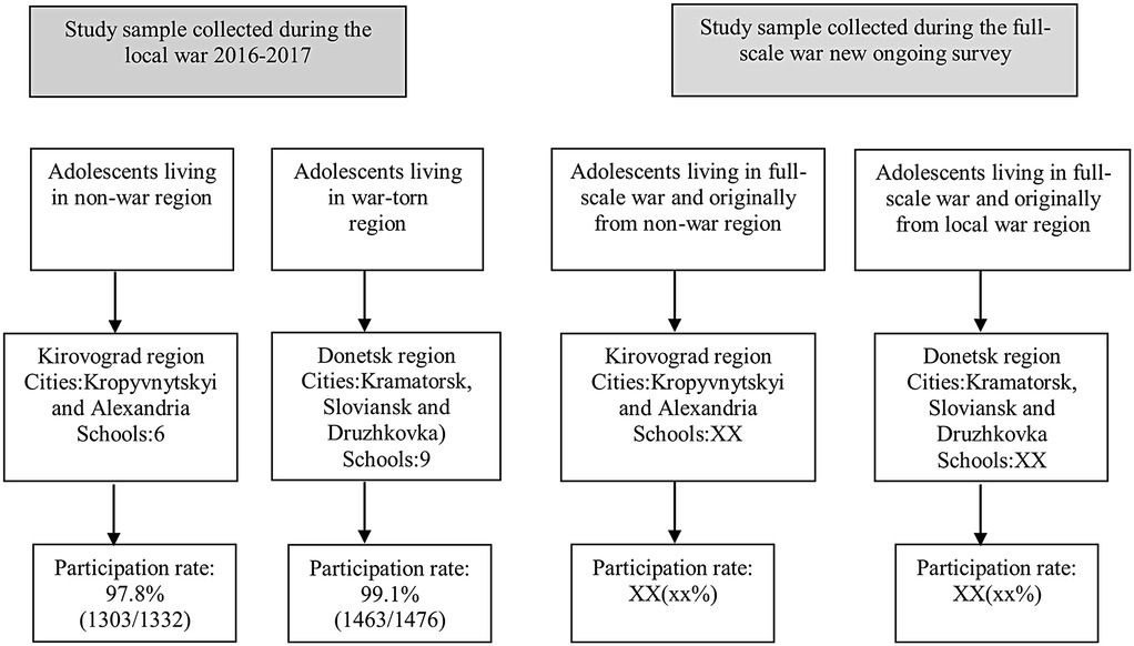 The present study, the Ukraine Adolescent Mental Health Study (UAMS), is unique as it includes two cross-sectional studies. One was conducted when Ukraine was first exposed to the local war in the eastern part of the country in 2014 and the other is being carried out after the full-scale war that started in 2022. In 2016–2017, we compared exposure to wartime traumatic stressors and the mental health of adolescents living in two regions: the Donetsk region of eastern Ukraine, which had experienced armed conflict since 2014, and the Kirovograd region, in central Ukraine, which had not been directly affected by war at that time. Based on the 2016–2017 data, we have previously reported that adolescents living in the local war-affected Donetsk region had higher levels of wartime traumatic stressors, psychopathology, suicidality and self-harm behavior than their peers in the Kirovograd region (21, 22). A similar cross-sectional study is ongoing among adolescents of the same age group from the same two regions using an identical design and the same methods. Collecting new data during the full-scale war provides us with a remarkable opportunity to compare the mental health of adolescents exposed to the various stages of war. Our aim is to explore the effects of differential wartime traumatic stressor exposure and displacement on the mental health of adolescents exposed to Russian invasion since 2014. Four samples will be examined. The two samples from 2016 to 2017 will be used to examine mental health of adolescents living in the war-affected Donetsk region and the non-war-affected Kirovograd region. The new survey samples will be used to examine adolescents exposed to the full-scale war in Ukraine, who were originally from the local war-affected Donetsk region and the central Kirovograd region that was not directly affected by the 2014 local war. Adolescents who have experienced the full-scale war, and are originally from the local war Donetsk region, will have been exposed to war for a longer period than the other three groups. Therefore, we hypothesize that they will have experienced heightened levels of psychopathology, suicidality and wartime traumatic stressor exposures than the other groups.