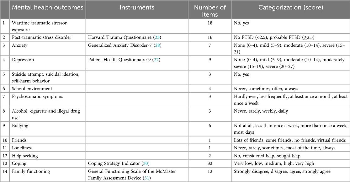 Exposure to wartime traumatic stressors is assessed using original questions developed by Ukrainian child and adolescent psychiatrists and psychologists working with adolescents exposed to war events. The questionnaire comprises 18 items addressing various types of war-related events, with yes/no responses. Adolescents in the new survey are asked to report wartime traumatic stressors that they have experienced since the beginning of the full-scale war in 2022. Five items have been added to the new survey to elucidate the nature of war exposure. PTSD symptoms are assessed with the Harvard Trauma Questionnaire (HTQ), an instrument used widely for adults and adolescents (23, 24). This self-report tool consists of the first 16 items of the PTSD criteria in the Diagnostic and Statistical Manual of Mental Disorders, Fourth Edition (DSM-IV). Respondents rate the frequency of symptoms experienced in the past six months on a scale from zero (not at all) to four (extremely frequent). Depressive symptoms are assessed using the nine-item Patient Health Questionnaire (PHQ-9), a self-administered tool that has been extensively used with both adults and adolescents (25–27). Anxiety symptoms are assessed with the Generalized Anxiety Disorder-7 (GAD-7) questionnaire, which has been widely used with both adults and adolescents (28, 29). This self-report tool comprises seven items based on the DSM-IV diagnostic criteria for generalized anxiety disorder. Respondents rate their symptoms in the last two weeks on a four-point Likert scale; zero for “not at all”, one for “several days”, two for “half of the days”, and three for “nearly every day”. The total score can range from 0 to 21.