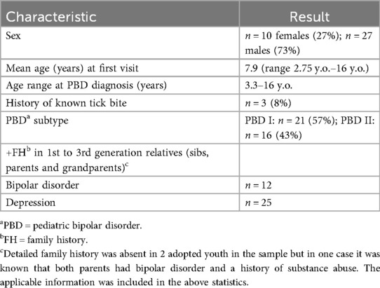 Introduction: This retrospective chart review examined 37 youth with pediatric bipolar disorder from a private practice in the Lyme-endemic state of New Jersey, expanding on findings from 27 previously reported cases to explore the potential contribution of tick-borne infections to disease etiology.
