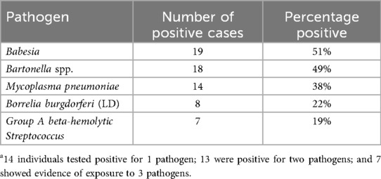 Results: Babesia was detected in 51% (19/37), Bartonella in 49% (18/37), Mycoplasma pneumoniae in 38% (14/37), Borrelia burgdorferi in 22% (8/37), and Group A Streptococcus in 19% (7/37). Overall, 92% (34/37) had evidence of tick-borne exposure, with 81% (30/37) meeting both laboratory and clinical criteria.