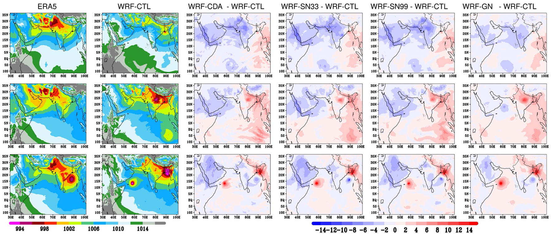 The mean seas level pressure (hPa) of ERA5 (First column) and WRF-CTL (Second column), and the differences in the mean sea level pressure between the WRF-CDA and WRF-CTL (Third column), WRF-SN33 and WRF-CTL (Fourth column), WRF-S99 and WRF-CTL (Fifth column), and WRF-GN and WRF-CTL (Sixth column) during normal (2016), excess (2013), and drought (2009) Indian Summer Monsoon seasons. First row is for normal, second row is for excess, and third row is for drought Indian Summer Monsoon seasons.