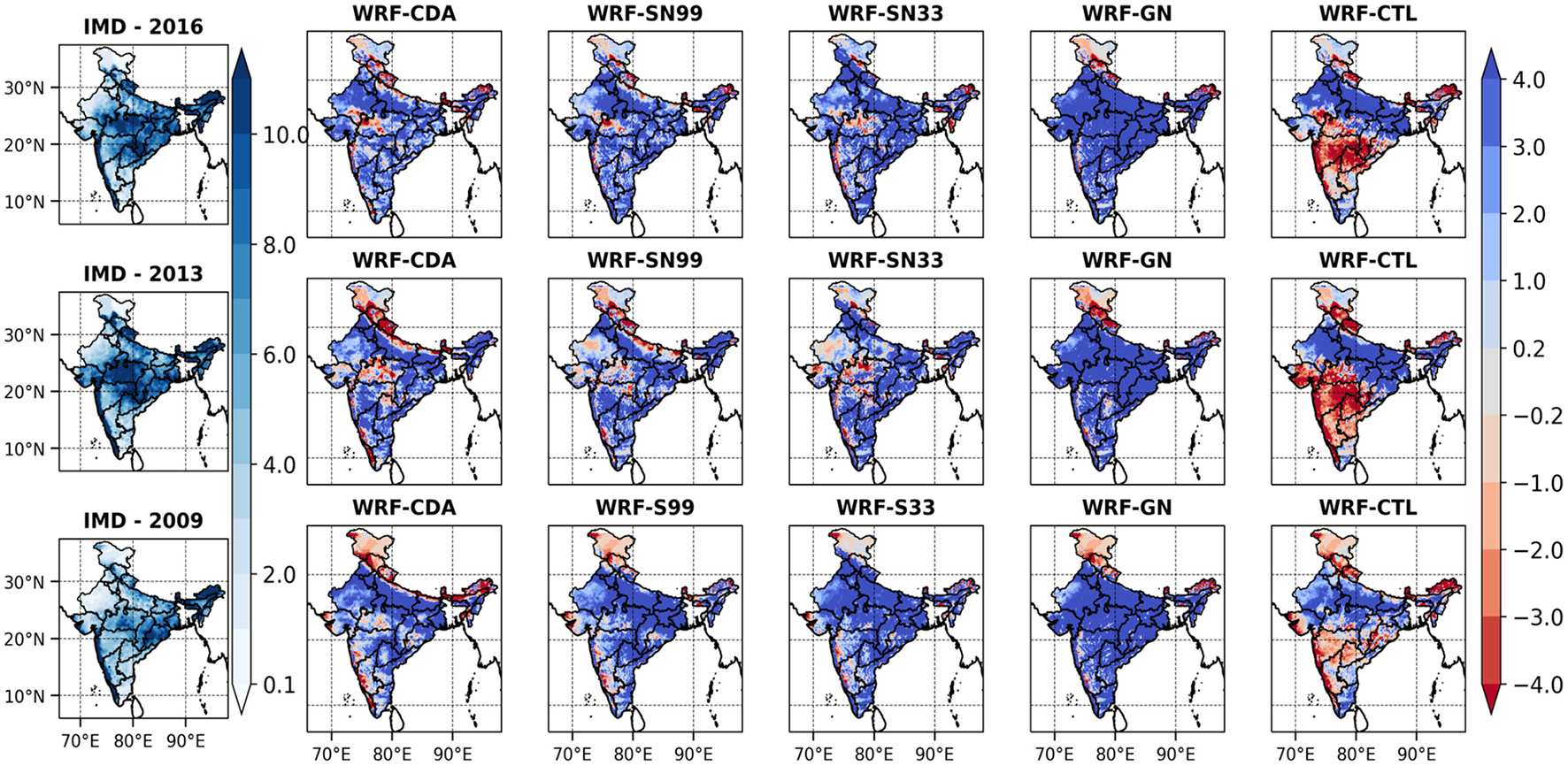 The India Meteorological observed mean seasonal rainfall (mm/day, First column) during normal (2016), excess (2013), and drought (2009) Indian Summer Monsoon seasons. Second, third, fourth, fifth, and sixth columns are the seasonal mean rainfall differences between the model (WRF-CDA, WRF-SN99, WRF-SN33, WRF-GN, and WRF-CTL, respectively) and IMD observations for all three seasons. First row is for normal, second row is for excess, and third row is for drought Indian Summer Monsoon seasons.