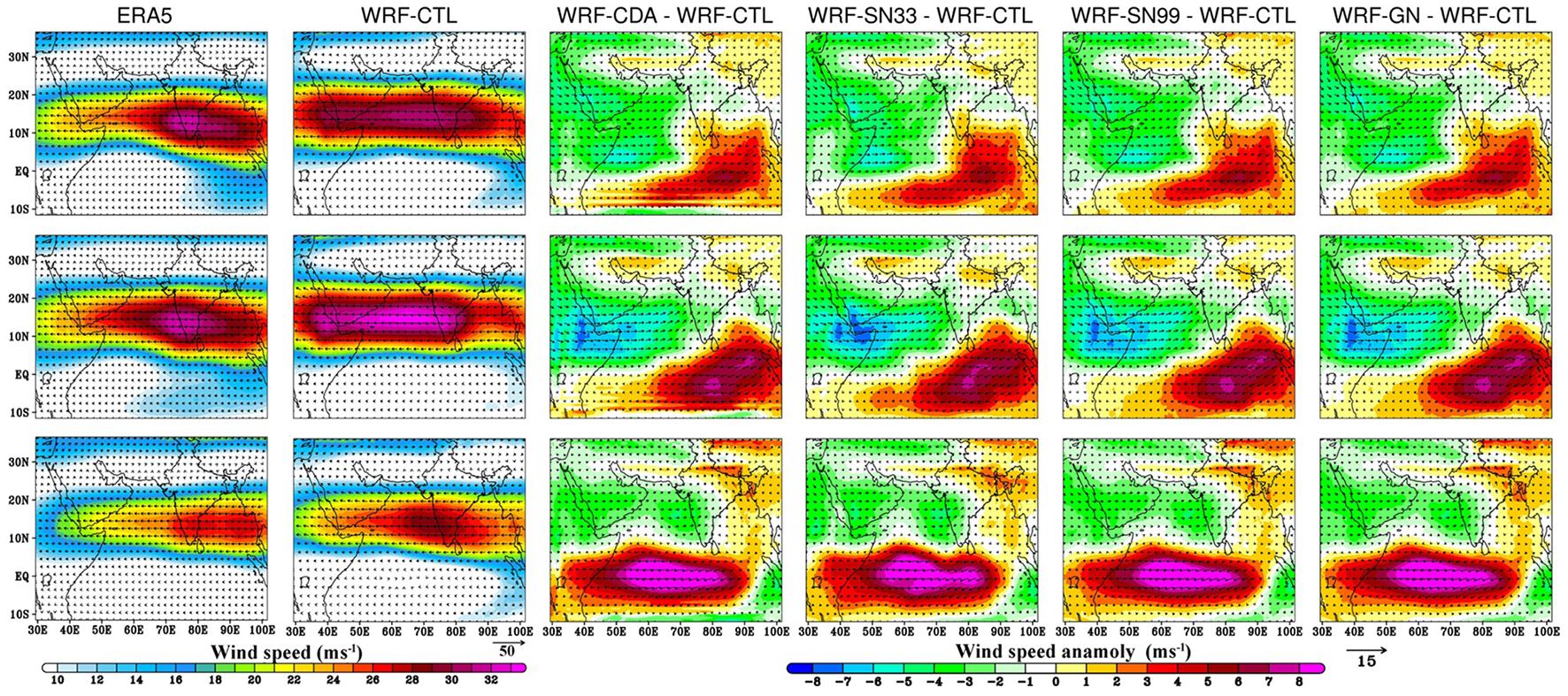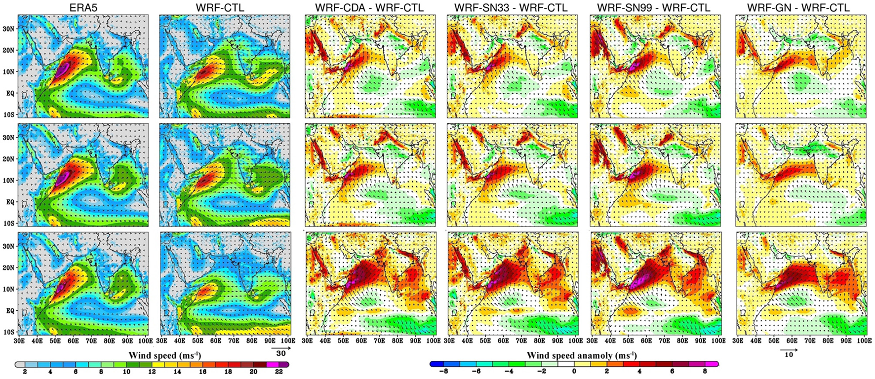 The mean seasonal winds (m/s) at 950 hPa of ERA5 (First column) and WRF-CTL (Second column), and the differences in the mean zonal wind shear (m/s) between the WRF-CDA and WRF-CTL (Third column), WRF-SN33 and WRF-CTL (Fourth column), WRF-S99 and WRF-CTL (Fifth column), and WRF-GN and WRF-CTL (Sixth column) during normal (2016), excess (2013), and drought (2009) Indian Summer Monsoon seasons. First row is for normal, second row is for excess, and third row is for drought Indian Summer Monsoon seasons.