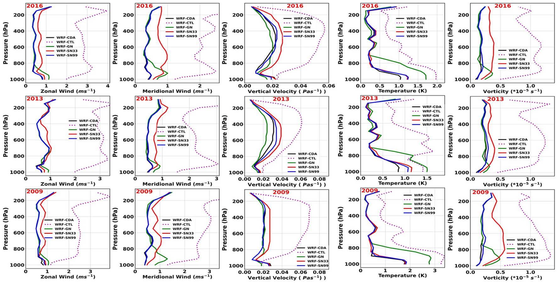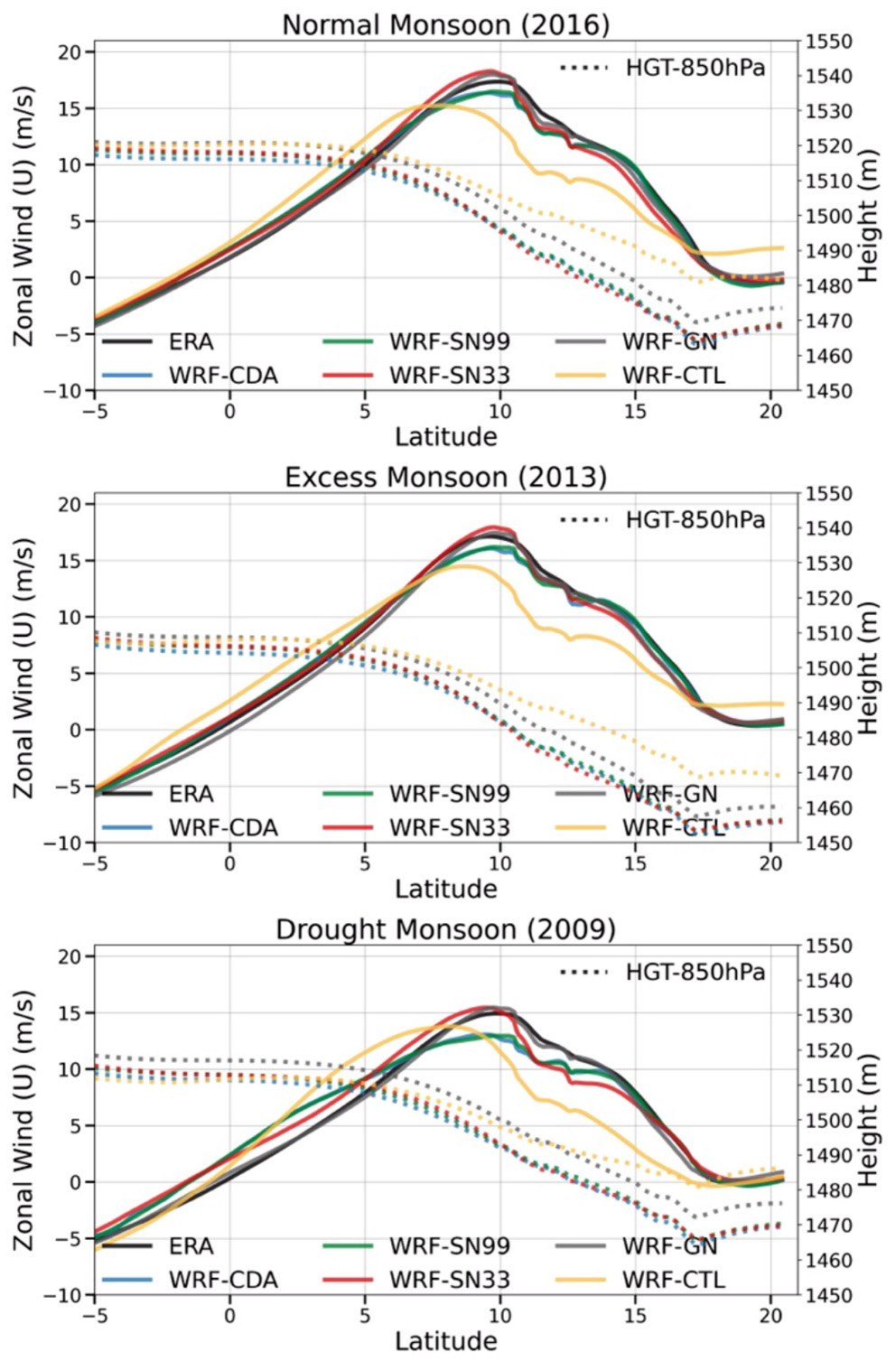 The zonal winds and geopotential height at 850 hPa (averaged over monsoon core region, 50–60E) averaged between the monsoon period presented in Figure 5. The analysis from ERA5 suggest that there is a gradual increase of zonal wind starting from southern hemisphere and crossed the equator and attained its maxima between 5 and10 N and thereafter start decreasing. The geopotential height is almost constant between the regions 5 S−5 N, its start decreasing after 5 N. All three ISM seasons show more or less similar features, however, with different magnitudes. Higher (lower) zonal winds noticeable between 5–10N during excess (drought) ISM seasons. These features are consistently well-represented by WRF-CDA and WRF-SN99 followed by WRF-SN33 than other simulations.