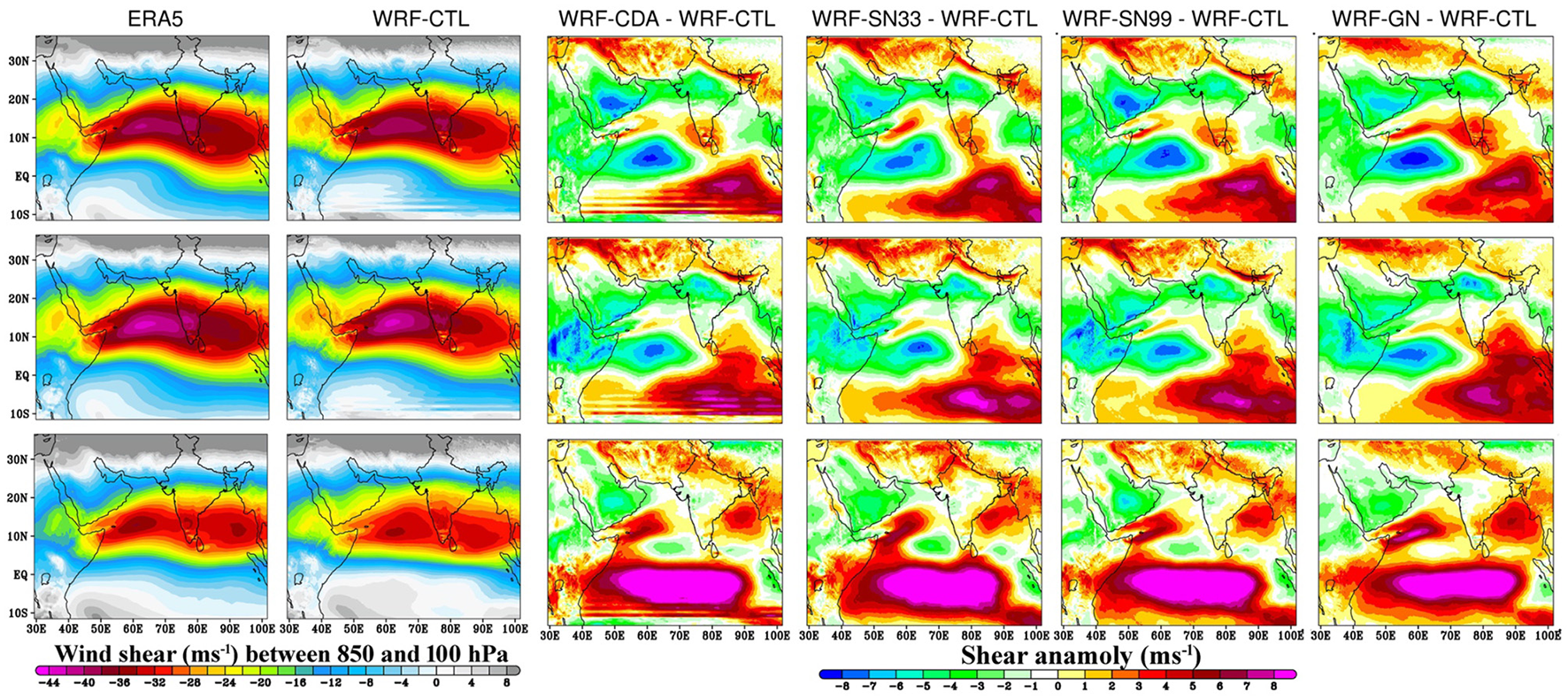 The mean seasonal zonal wind shear (m/s) between 850 hPa and 100 hPa levels of ERA5 (First column) and WRF-CTL (Second column), and the differences in the mean zonal wind shear (m/s) between the WRF-CDA and WRF-CTL (Third column), WRF-SN33 and WRF-CTL (Fourth column), WRF-S99 and WRF-CTL (Fifth column), and WRF-GN and WRF-CTL (Sixth column) during normal (2016), excess (2013), and drought (2009) Indian Summer Monsoon seasons. First row is for normal, second row is for excess, and third row is for drought Indian Summer Monsoon seasons.