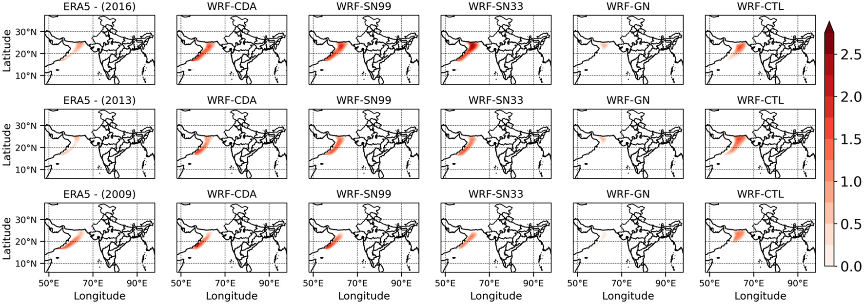 The MOK estimated using the four different methods as resulting from the downscaling simulations of the investigated monsoon seasons is outlined in Table 2. IMD announced the MOK for the normal (2016), excess (2013), and drought (2009) years on 8 June, 1 June, and 23 May, respectively. The identified MOK by the four methods suggests that the CDA and spectral nudging experiments accurately simulate the MOK within ±2 to 3 days of the observed MOK dates. The WRF-CTL experiment using Wang and Fan Index (Wang and Fan, 1999) simulated a delayed MOK by about 9 days (17 June) in the normal ISM, an early MOK by about 7 days (23 May) during the excess ISM, but agrees well with the IMD MOK date (23 May) during the drought monsoon season. Further, the increased west Asian surface pressure gradient between the Middle East and the West Equatorial Indian Ocean can potentially play a role in the occurrence of MOK through intensified low-level jet (Chakraborty and Agrawal, 2017). The distinct monsoon conditions exhibit (Figure 1) noticeable differences in the surface pressure gradients, which in turn modulate the onset dates of each monsoon season (Joseph et al., 1994; Chakraborty and Agrawal, 2017). Different downscaling techniques seem to have significant impact on reproducing the distinct patterns related to the different monsoon years. For instance, the reasonable representation of pressure gradients by CDA helps to achieve an accurate estimate of the onset dates compared to the standard nudging methods. Spectral nudging further showed important sensitivity to the choice of the wave numbers have in terms of the simulation of the pressure gradients and the corresponding onset dates. Spectral nudging simulations generally improved with higher number of waves and became comparable to CDA, when its number were retained. Overall, the dynamical downscaling simulations using the different nudging techniques successfully estimated the dates of MOK using the large-scale (TTGI and WYI) and small-scale (HOWI and WFI) indices, in agreement with the IMD. In contrast, WRF-CTL provided good estimate of MOK using the indices based on large-scale (TTGI and WYI), but not using those based on the small-scale features (HOWI and WFI), pointing to weaknesses at resolving ISM fine-scale features.