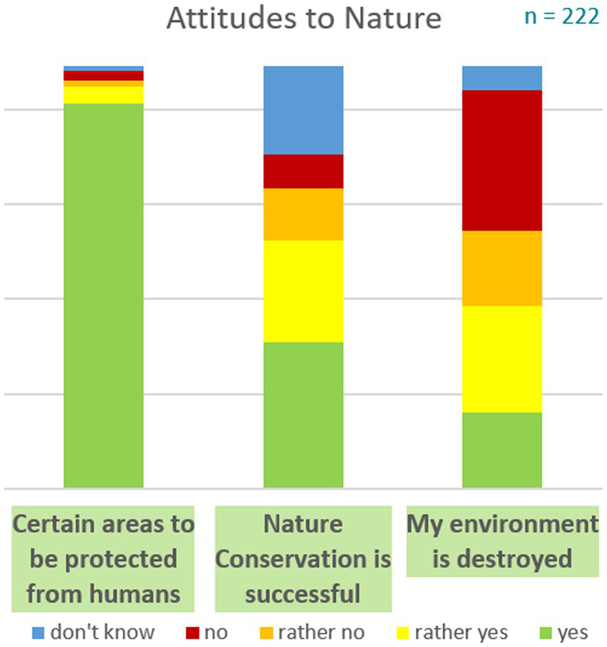 All 222 participants reacted to the statement “Certain areas should be protected from human utilization,” 203 respondents completely agreed, and another 9 people answered, “rather yes” (see Figure 2); and 60% of participants agreed to the statement, “environmental and nature conservation have already had a lot of success in this region.” Living along the North Sea or Baltic Sea shows insignificant, negligible correlations, but age positively correlates with seeing success. However, 20% of the respondents being unsure and 20% of them denying success might still be a sign of skepticism (see Figure 2). The statement “My environment is destroyed” invoked mixed reactions with almost as many yes as no answers. Many people reacted emotionally and explained their choice of answer. The younger the respondents were, the more likely they agreed with the statement.