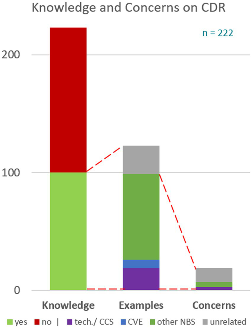 In the next step, a yes/no question was asked: “Do people know ways to extract greenhouse gases like CO2 out of the atmosphere?” However, 122 of the 222 participants (55%) responded negatively for this aspect. If the participants responded positively, two consecutive open questions followed: First, respondents were asked to give at least one example, and second, respondents were asked to express concerns about this example (see Figure 8). In total, 100 respondents (45%) shared ideas on how this might be done. Therefore, 24 people mentioned activities to reduce emissions but not to remove emissions, such as driving electric cars. The remaining 76 respondents mentioned methods of CO2 extraction (99 times). Mostly, more nature-based solutions were mentioned (80 times) with a focus on planting trees (47 times). Less frequently, respondents mentioned the rewetting of peatlands (15 times) or CVEs (7 times). Apart from more nature-based solutions, 19 people mentioned technical solutions. Those participants who gave detailed answers were asked about their concerns. Only 7 had related concerns, of which 4 were connected to nature-based solutions and 3 regarded technical solutions. They viewed nature-based solutions as limited and time intensive, and technical solutions as difficult to apply and as potential safety risks. Twelve respondents did not stick to the topic and mentioned concerns against coal plants, fracking, or the production of batteries.