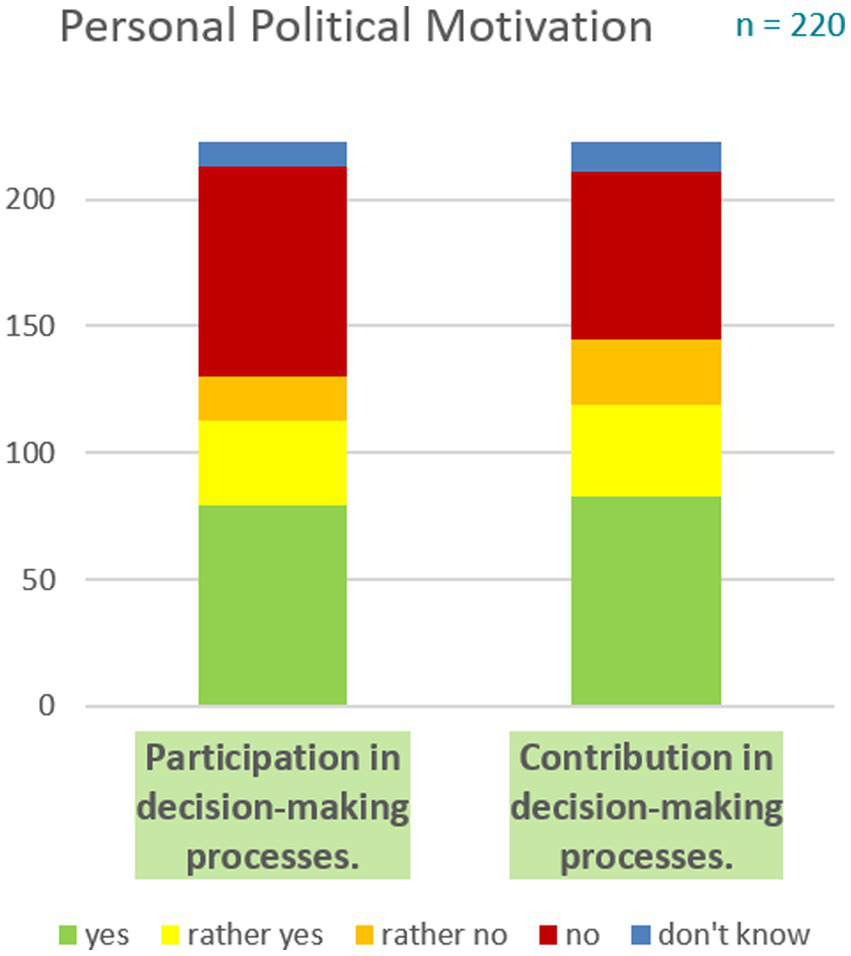 When asked about their contributions to their home (“Heimat”), two-thirds of the respondents viewed themselves as actively engaging in their home region, which is a comparatively high rate of respondents having an answer to the question (see for comparison Ratter and Weig, 2012). Most respondents were engaged in social activities such as caring for the elderly, and a quarter of the respondents voluntarily engaged in keeping their environment clean and unpolluted. Furthermore, 96 respondents organized themselves in clubs mostly regarding sports, allotment gardening, the church, or nature conservation. Half of our respondents agreed with the statement, “I want to be more engaged in decision-making processes,” while the other half disagreed. The same reactions appeared to the following statement, “I could contribute new ideas in such decision-making processes” (see Figure 9). “Being engaged” and “wanting to be more engaged in decision-making processes” show no significant correlations. Correlations show that the motivation for political engagement decreases with age. As age and having children correlate, parents also show less motivation to participate in decision-making processes. People from Lower Saxony are slightly more willing to engage than people in Schleswig-Holstein.