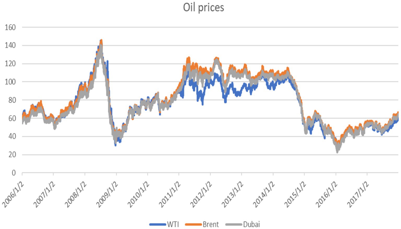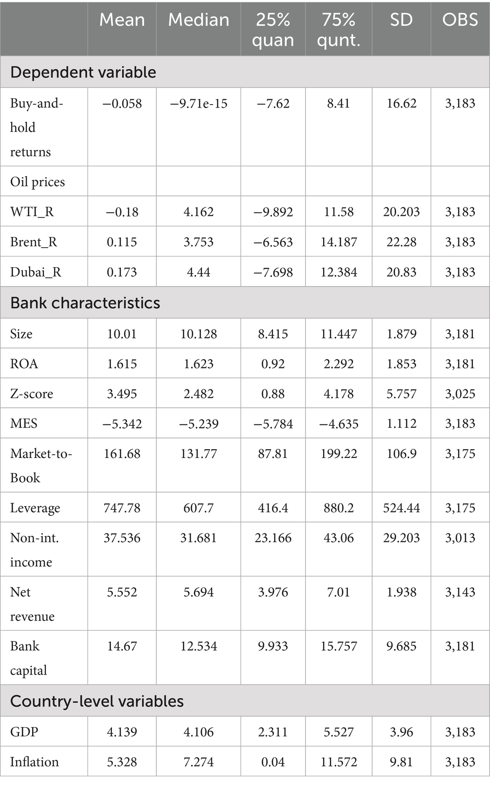Following Irresberger et al. (2015) and Garel and Petit-Romec (2017), we collect quarterly accounting data related to idiosyncratic bank characteristics from Bloomberg. The stock price data for the selected banks are also collected from Bloomberg. We aggregate daily returns to compute quarterly buy-and-hold returns. The oil price data for WTI, Brent, and Dubai benchmarks are collected from DataStream. Similar to the calculation of quarterly buy-and-hold returns for banks, we aggregate the quarterly returns of three oil benchmark prices to match the frequency of the accounting and buy-and-hold returns for banks. The macro variables for the robustness tests, namely GDP growth and inflation, which are collected at an annual frequency, are sourced from the World Bank.3 Finally, following Beltratti and Stulz (2012) and Irresberger et al. (2015), we winsorize the quarterly bank buy-and-hold returns and bank-level accounting-based characteristics at the 1st and 99th percentiles to reduce potential outlier influence. The statistics for all variables are presented in percentage form in Table 2.