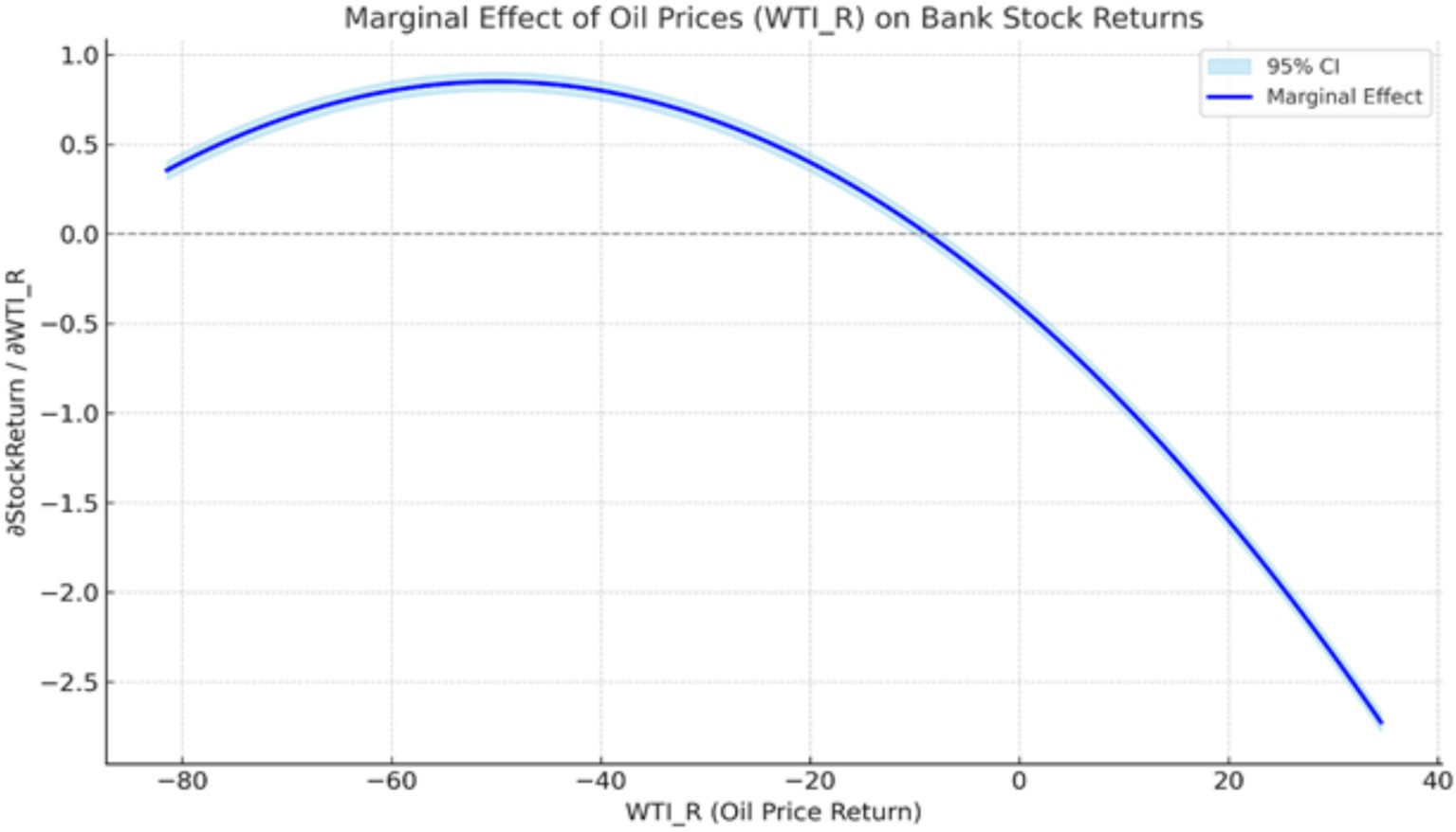 To visualize this effect, we plot the marginal effect of oil price changes on bank stock returns across the observed range (Figure 2). The downward-sloping curve confirms that the impact of oil price movements decreases and eventually becomes negative, with the shaded confidence bands indicating statistical significance at conventional levels.
