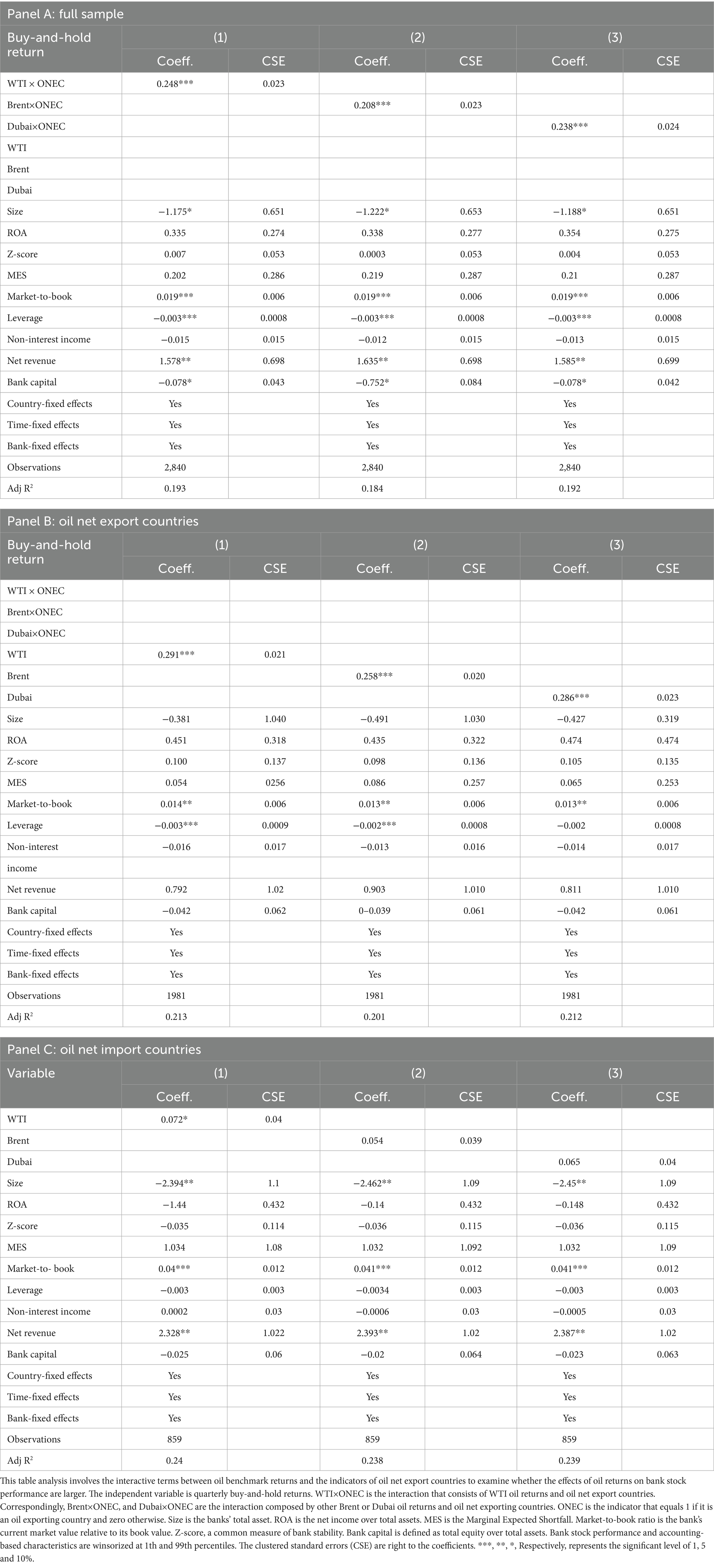 Table 5 analysis involves the interactive terms between oil benchmark returns and the indicators of oil-exporting countries to examine whether the effects of oil returns on bank stock performance are larger. The independent variable is quarterly buy-and-hold returns. WTI × ONEC refers to the interaction between WTI oil returns and oil-exporting countries. Correspondingly, Brent×ONEC and Dubai×ONEC are the interactions composed of other Brent or Dubai oil returns, as well as oil-exporting countries. ONEC is the indicator that equals 1 if the country is an oil exporter and 0 otherwise. Size refers to the bank’s total assets. ROA is the net income over total assets. MES is the Marginal Expected Shortfall. The market-to-book ratio represents the bank’s current market value in relation to its book value. The Z-score is a common measure of bank stability. Bank capital is defined as total equity over total assets. Bank stock performance and accounting-based characteristics are winsorized at the 1st and 99th percentiles. The clustered standard errors (CSE) are right to the coefficients. ***, **, *, respectively, represents significance levels of 1, 5, and 10%.