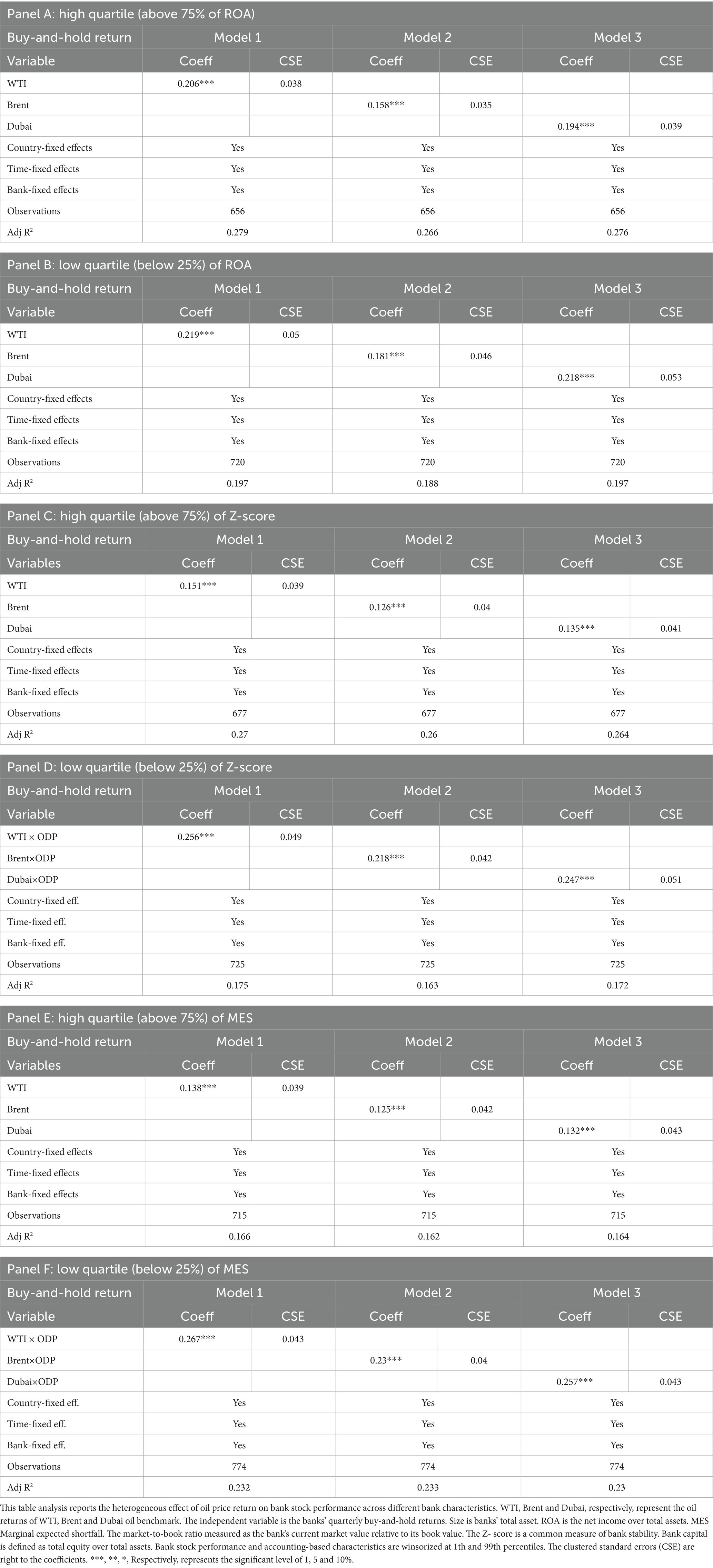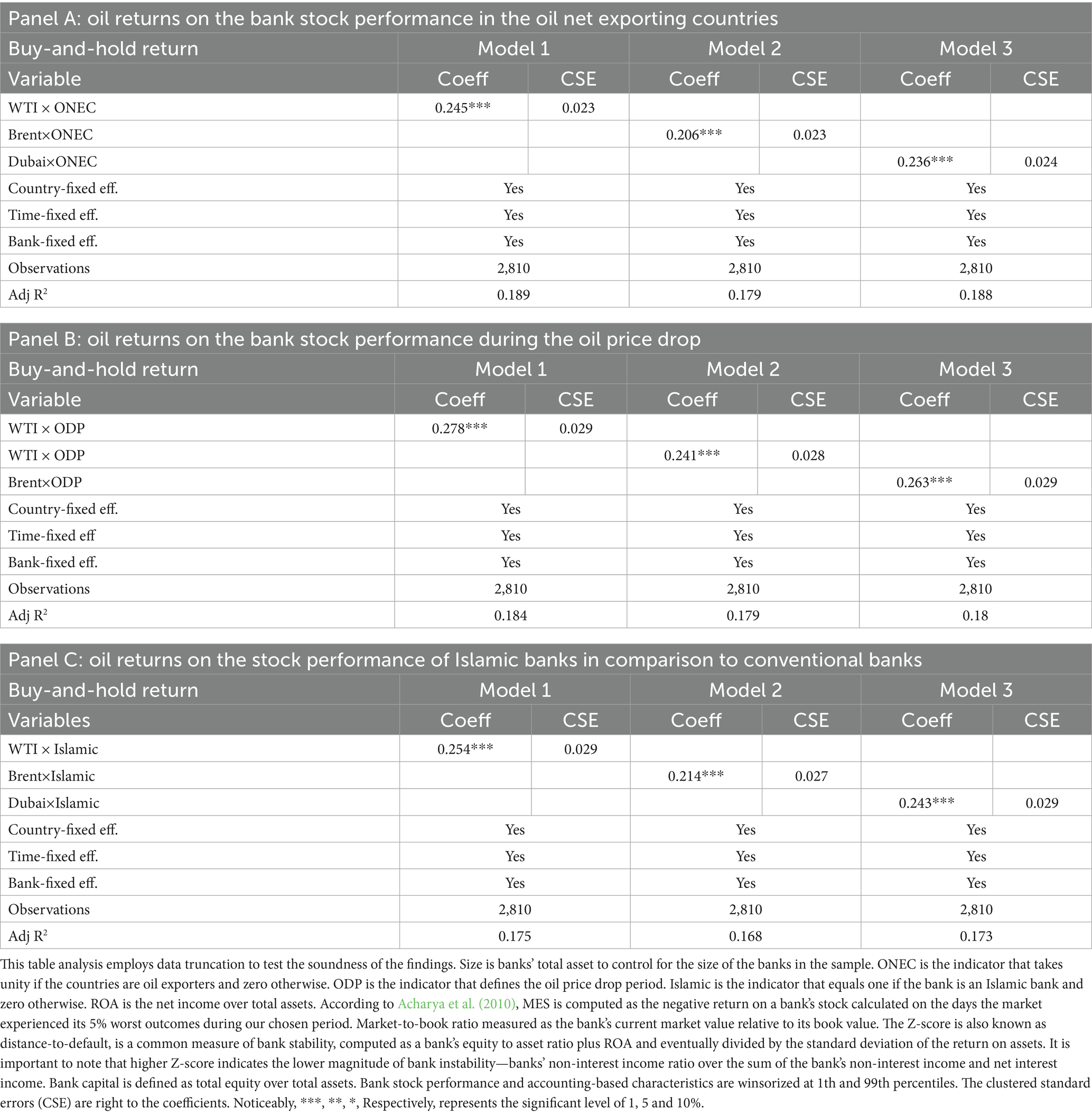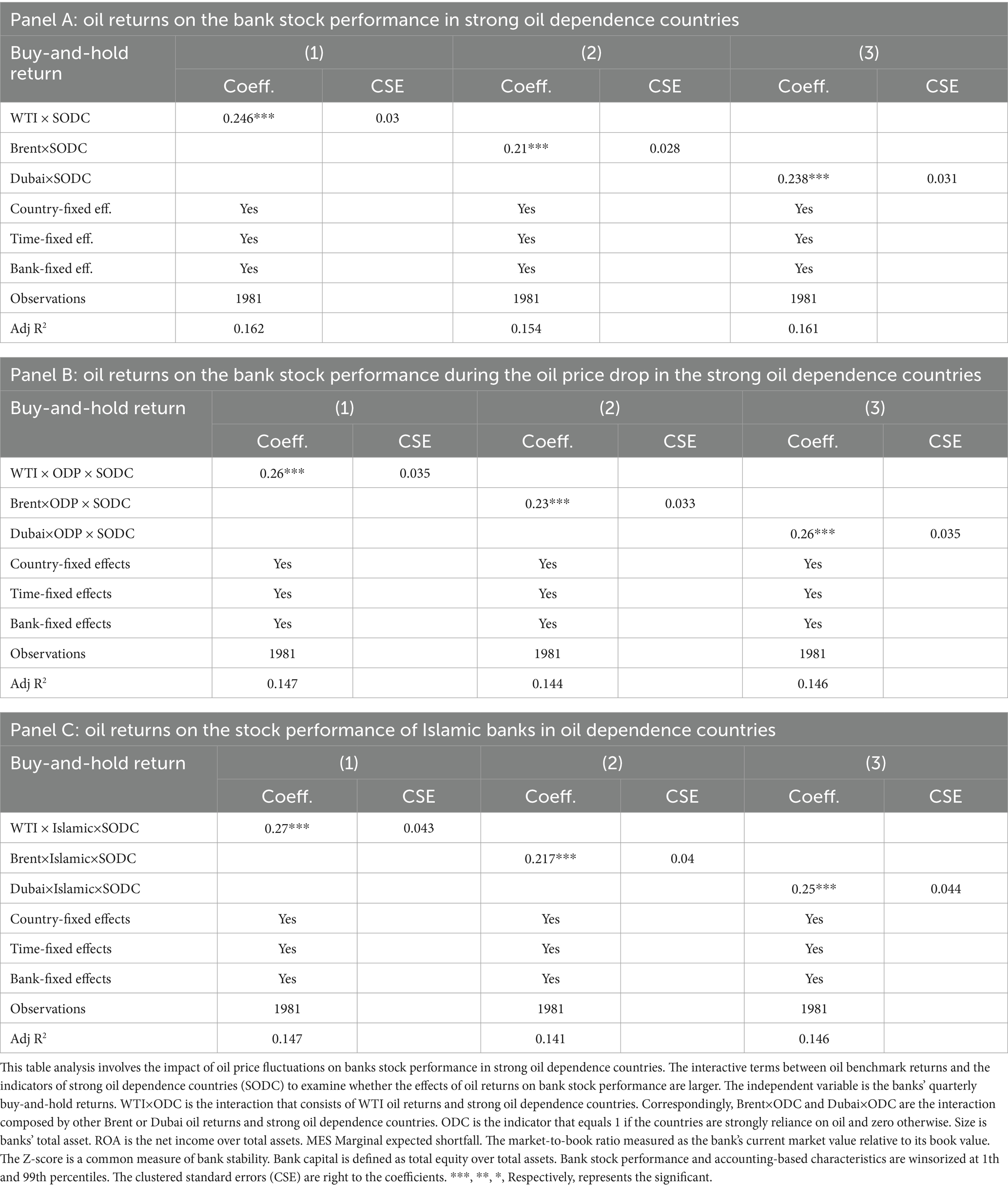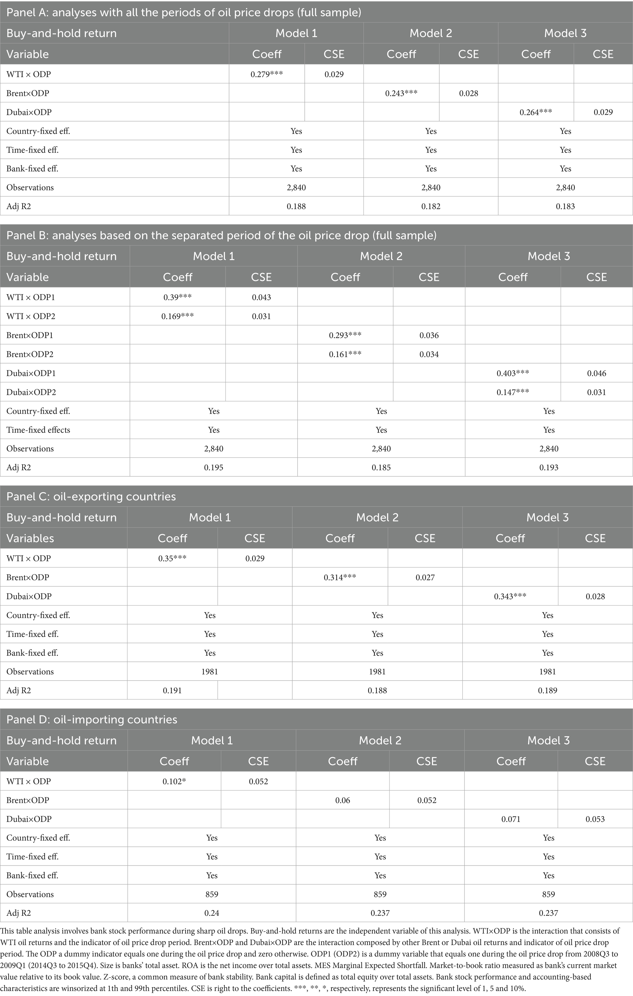 Table 8 analysis examines the impact of oil price fluctuations on the stock performance of banks in oil-dependent countries. The interactive terms between oil benchmark returns and the indicators of strong oil dependence countries (SODC) are examined to determine whether the effects of oil returns on bank stock performance are larger. The independent variable is the banks’ quarterly buy-and-hold returns. WTI × ODC refers to the interaction between WTI oil returns and oil-dependent countries. Correspondingly, Brent×ODC and Dubai×ODC are the interactions composed of other Brent or Dubai oil returns and strong oil-dependent countries. ODC is the indicator that equals 1 if the country is strongly reliant on oil and 0 otherwise. Size is the bank’s total assets. ROA is the net income over total assets. MES: Marginal expected shortfall. The market-to-book ratio is calculated as the bank’s current market value divided by its book value. The Z-score is a common measure of bank stability. Bank capital is defined as total equity over total assets. Bank stock performance and accounting-based characteristics are winsorized at the 1st and 99th percentiles. The clustered standard errors (CSE) are right to the coefficients. ***, **, and* represent the significance levels, respectively.