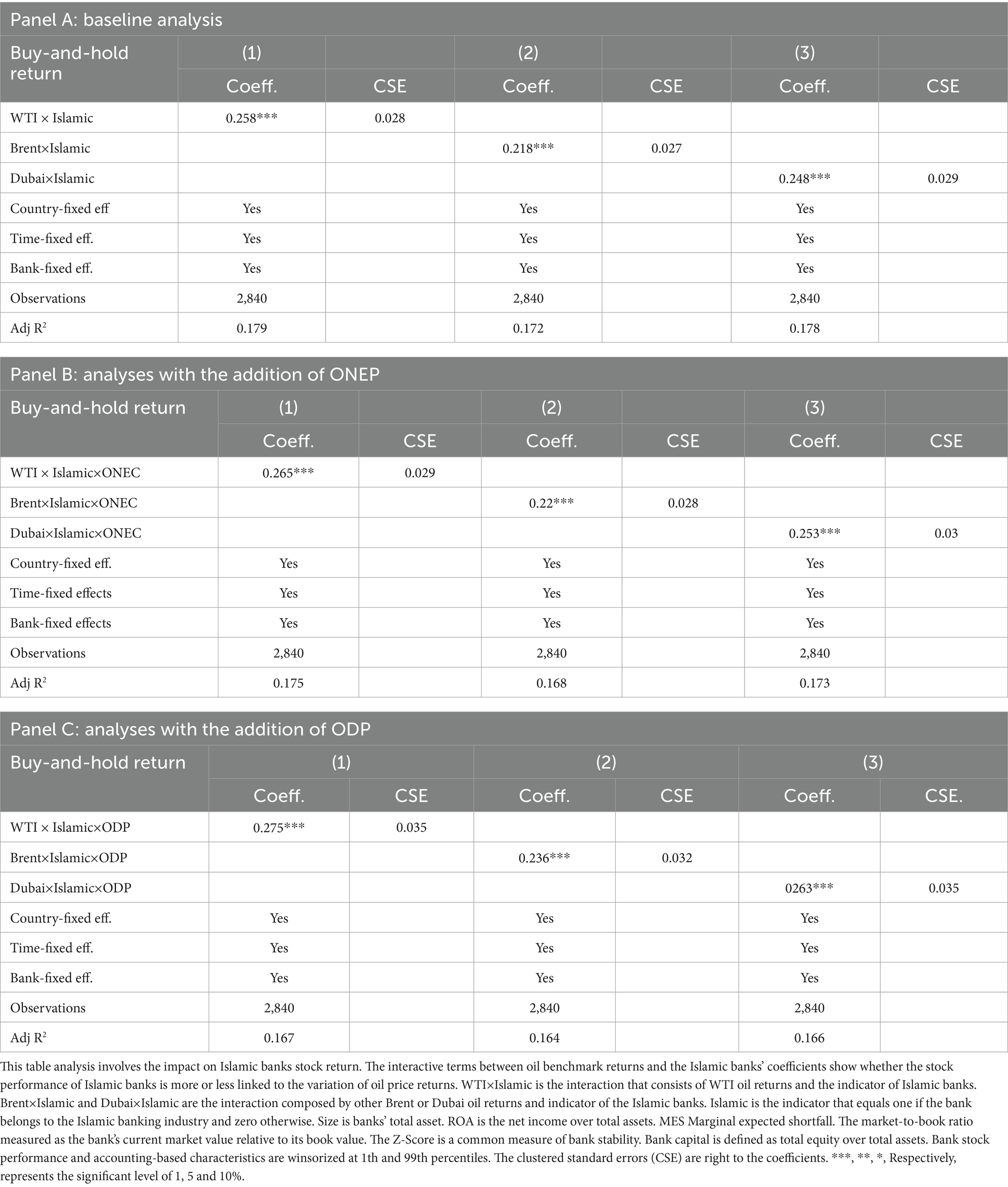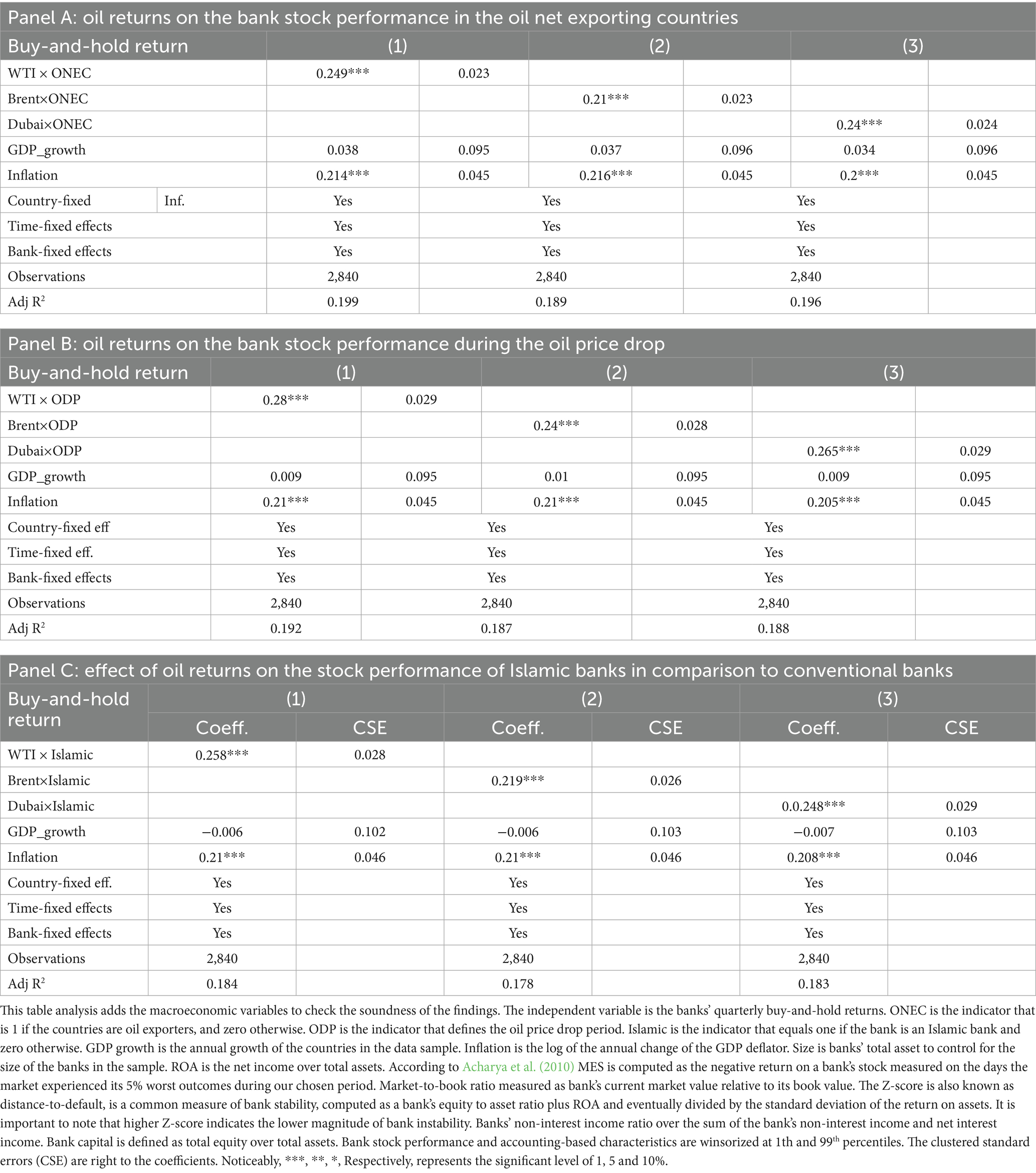 Table 13 analysis incorporates macroeconomic variables to validate the soundness of the findings. The independent variable is the banks’ quarterly buy-and-hold returns. ONEC is the indicator that equals 1 if the country is an oil exporter and 0 otherwise. ODP is the indicator that defines the period of the oil price drop. Islamic is the indicator that equals one if the bank is an Islamic bank and zero otherwise. GDP growth refers to the annual growth rate of the countries in the data sample. Inflation is the log of the annual change of the GDP deflator. Size is the bank’s total assets, used to control for the size of the banks in the sample. ROA is the net income over total assets. According to Acharya et al. (2010), MES is computed as the negative return on a bank’s stock measured on the days the market experienced its 5% worst outcomes during our chosen period. The market-to-book ratio is calculated as a bank’s current market value divided by its book value. The Z-score, also known as distance-to-default, is a common measure of bank stability, computed as a bank’s equity-to-asset ratio plus ROA and eventually divided by the standard deviation of the return on assets. It is important to note that a higher Z-score indicates a lower magnitude of bank instability. A bank’s non-interest income ratio is the sum of the bank’s non-interest income and net interest income divided by the bank’s non-interest income. Bank capital is defined as total equity over total assets. Bank stock performance and accounting-based characteristics are winsorized at the 1st and 99th percentiles. The clustered standard errors (CSE) are right to the coefficients. Notably, ***, **, and *, respectively, represent significance levels of 1, 5, and 10%.