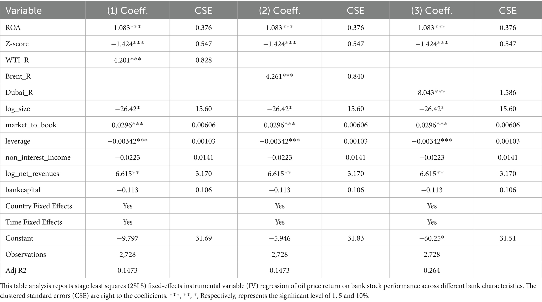 The IV model is estimated with country-fixed effects and time-fixed effects to absorb unobservable heterogeneity and macroeconomic fluctuations. The results, presented in Table 10, are consistent with our baseline findings: ROA remains positively associated with stock returns, while the Z-score exhibits a significant negative relationship. Crucially, oil return variables (WTI, Brent, and Dubai) continue to display robust and statistically significant positive coefficients, reinforcing the central conclusion that oil price movements are a key driver of bank stock performance. The model is estimated using a 2SLS fixed-effects specification with country and time (quarterly) fixed effects, ensuring control for unobserved heterogeneity and macroeconomic influences. The following Stata command summarizes the specification: