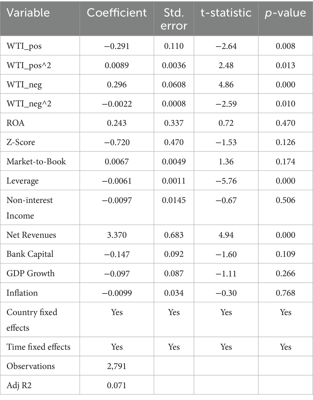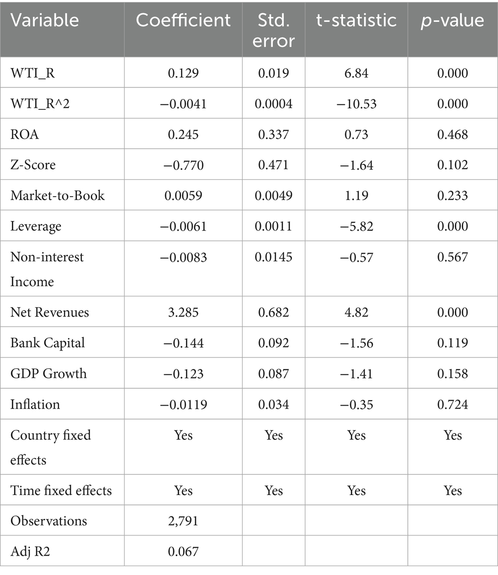 To assess whether the relationship between oil prices and bank stock returns is non-linear, we augment our baseline fixed-effects regression model by including a squared term for oil price returns (WTI_R^2). The estimation results, presented in Table 11, show that both the linear and squared terms are statistically significant. The positive coefficient on the linear term and the negative coefficient on the squared term indicate a concave relationship, consistent with the concept of diminishing marginal returns as oil prices rise. This result implies that while moderate oil price increases may initially boost bank stock returns—likely reflecting improved economic outlook and lending conditions—the marginal benefit weakens at higher price levels. Beyond a certain threshold, further increases may introduce inflationary pressure or market instability, thus negatively affecting bank performance.
