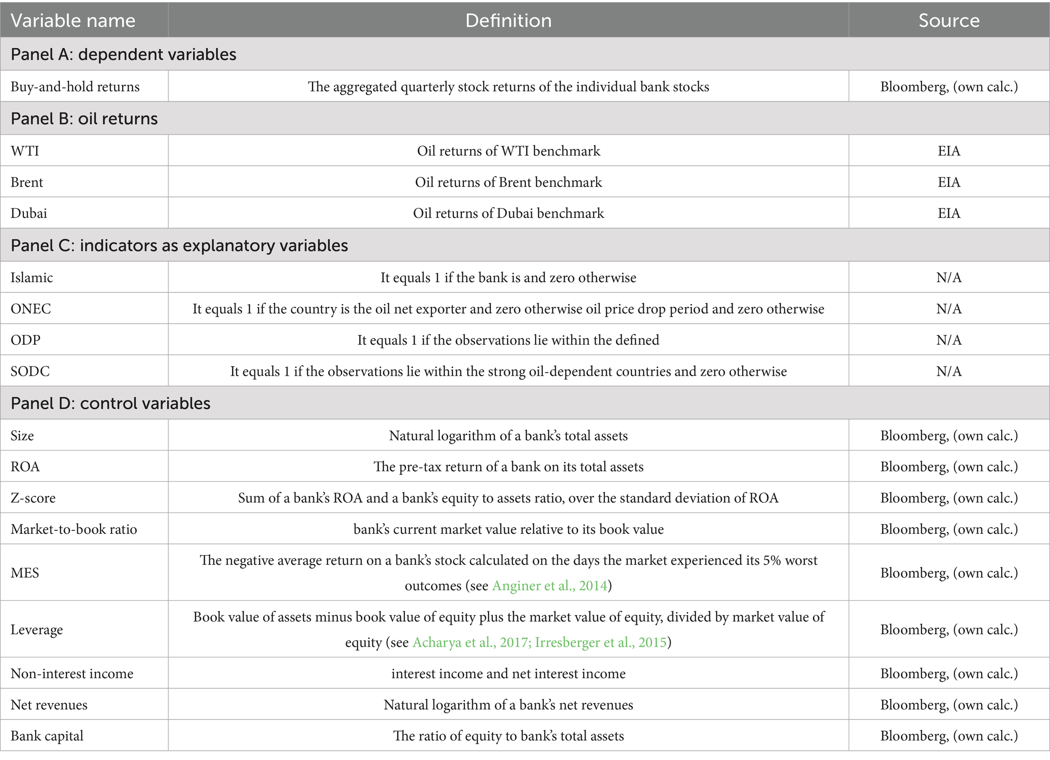 The selection of buy-and-hold returns in Equation 1 as the proxy of the dependent variable, which is bank stock performance, is based on Irresberger et al. (2015). EV𝑐,𝑡 refers to the major explanatory variables in our study that contains the interactive terms composed by the oil returns and country category (i.e., oil net exporting and importing countries) and the interactions of oil returns and sharp oil price drops (i.e., 2008–2009 and 2014–2015). It is worth noting that we aim to investigate whether Islamic banks are more sensitive to variations in oil prices. To fulfill this research purpose, we add the interaction term, namely 𝐼𝑠𝑙𝑎𝑚𝑖𝑐 × 𝑂𝑖𝑙 𝑟𝑒𝑡𝑢𝑟. 𝑂𝑖𝑙 𝑟𝑒𝑡𝑢𝑟𝑛, which consists of a set of explanatory variables, namely WTI, Brent, and Dubai crude returns. 𝐼𝑠𝑙𝑎𝑚𝑖𝑐 is an indicator variable that equals one if the bank is an Islamic bank and zero otherwise.