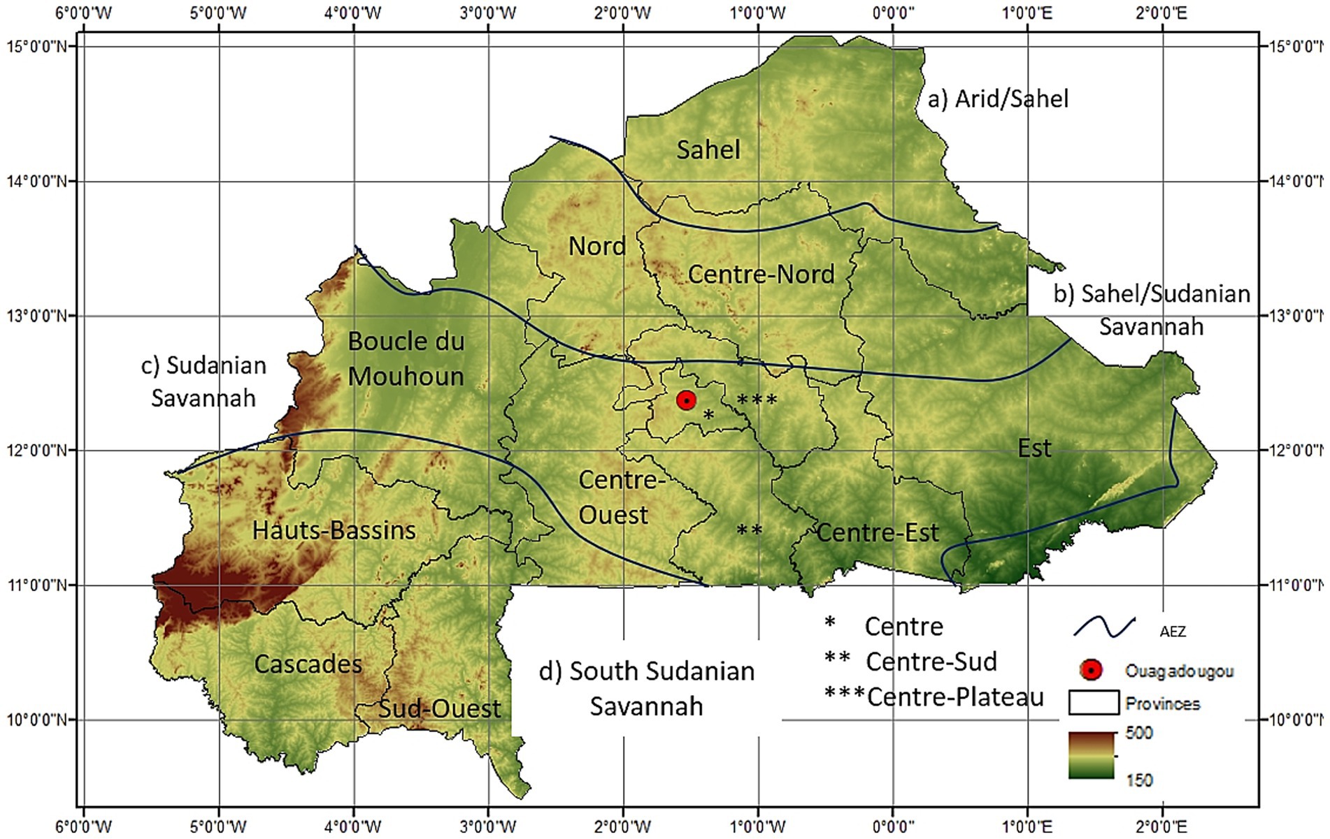 Figure 1. Digital elevation model of Burkina Faso including the different agro-ecological zones (AEZ) of Burkina Faso: (a) Arid/Sahel, (b) Sahel/Sudanian savanna, (c) Sudanian savanna, (d) South-Sudanian savanna (Ayantunde et al., 2023).
