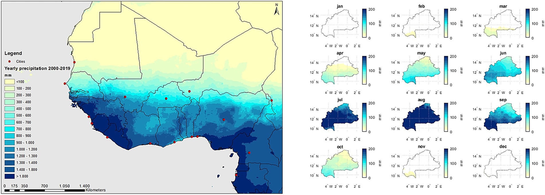 Left side shows a map of West Africa depicting yearly precipitation from 2000-2019, with varying shades indicating different precipitation levels. Right side shows monthly precipitation maps for an unspecified region, highlighting changing patterns from January to December through varying shades.