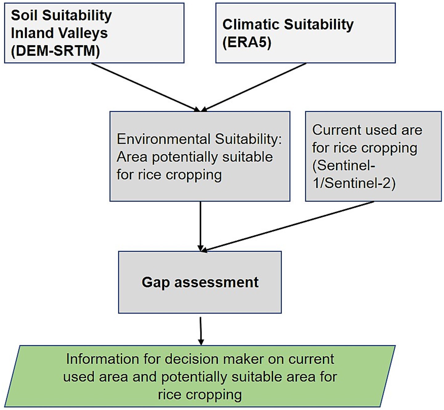 The methods are described in the following sections in three sub chapters: the mapping of the inland valleys, the climatic suitability and the mapping of the currently used rice areas. Figure 3 shows the approach and how the different aspects of the study are combining the result. The environmental suitability index is derived by combining two components: soil suitability, based on the spatial distribution of inland valleys, and climatic suitability, assessed using a fuzzy logic approach. Potential rice areas are identified as locations meeting both suitability criteria. The gap assessment compares these potentially suitable areas with the currently cultivated rice areas to highlight underutilized regions with high suitability for expansion.