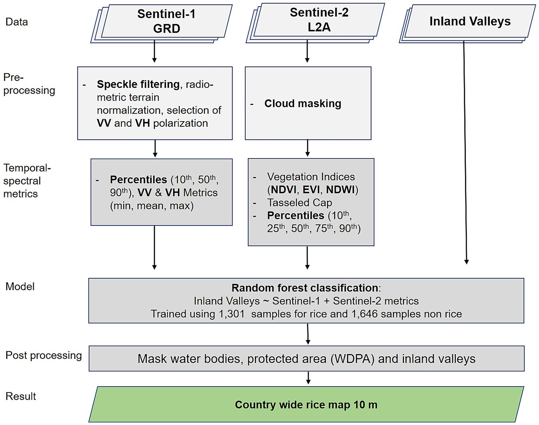 Flowchart illustrating the process of creating a country-wide rice map at ten-meter resolution using Sentinel-1 and Sentinel-2 data. It includes three main steps: pre-processing, temporal-spectral metrics, and modeling. Pre-processing involves speckle filtering, radiometric terrain normalization, and cloud masking. Temporal-spectral metrics encompass percentiles and various indices like NDVI, EVI, and NDWI. The model uses random forest classification and is trained with data samples from rice and non-rice areas. Post-processing involves masking water bodies, protected areas, and inland valleys.