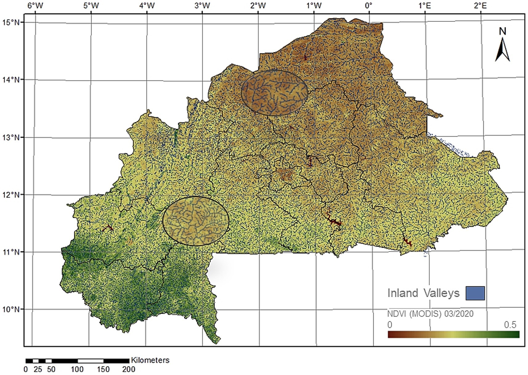 Map of Burkina Faso displaying inland valleys marked in blue. It uses NDVI (MODIS) data from March 2020, with a gradient ranging from brown (low vegetation) to green (high vegetation). Two ovals highlight specific areas. A scale bar is at the bottom.