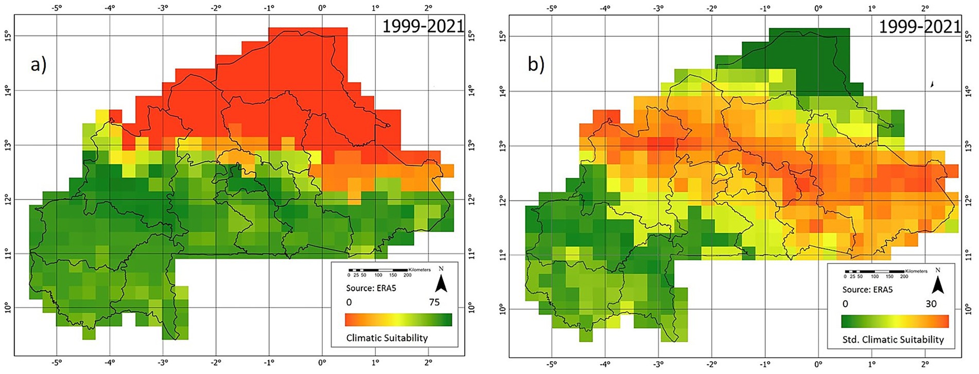 This process was repeated annually from 1999 to 2021, to identify one suitability value per year. These values capture interannual climatic variability and support the analysis of long-term trends and climate-related vulnerability in inland valley rice cropping across Burkina Faso.