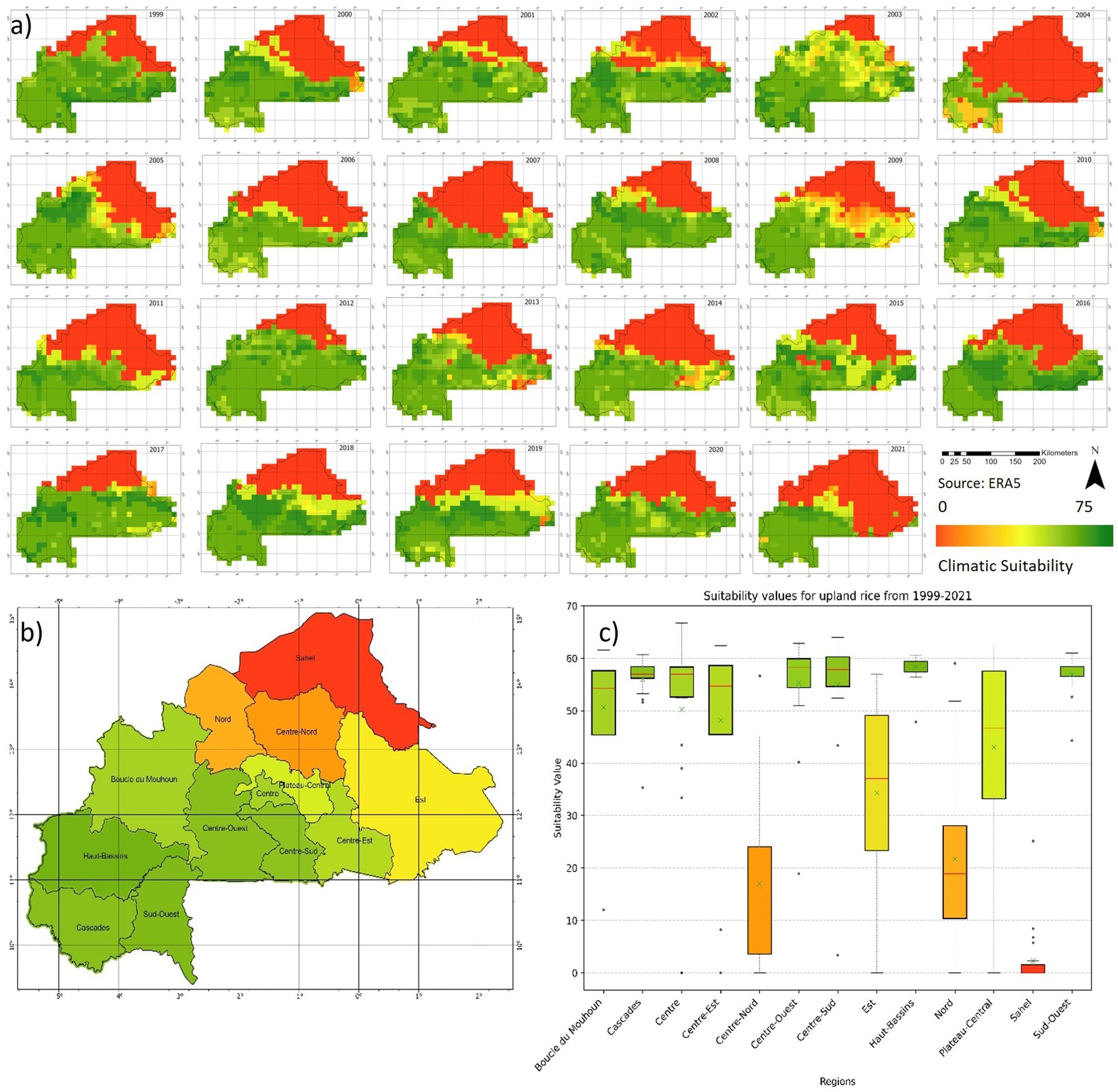 Figure 7. Annual suitability maps from 1999–2021 (a), the mean suitability values for the 13 different regions in Burkina Faso (b) and the yearly variability (c).