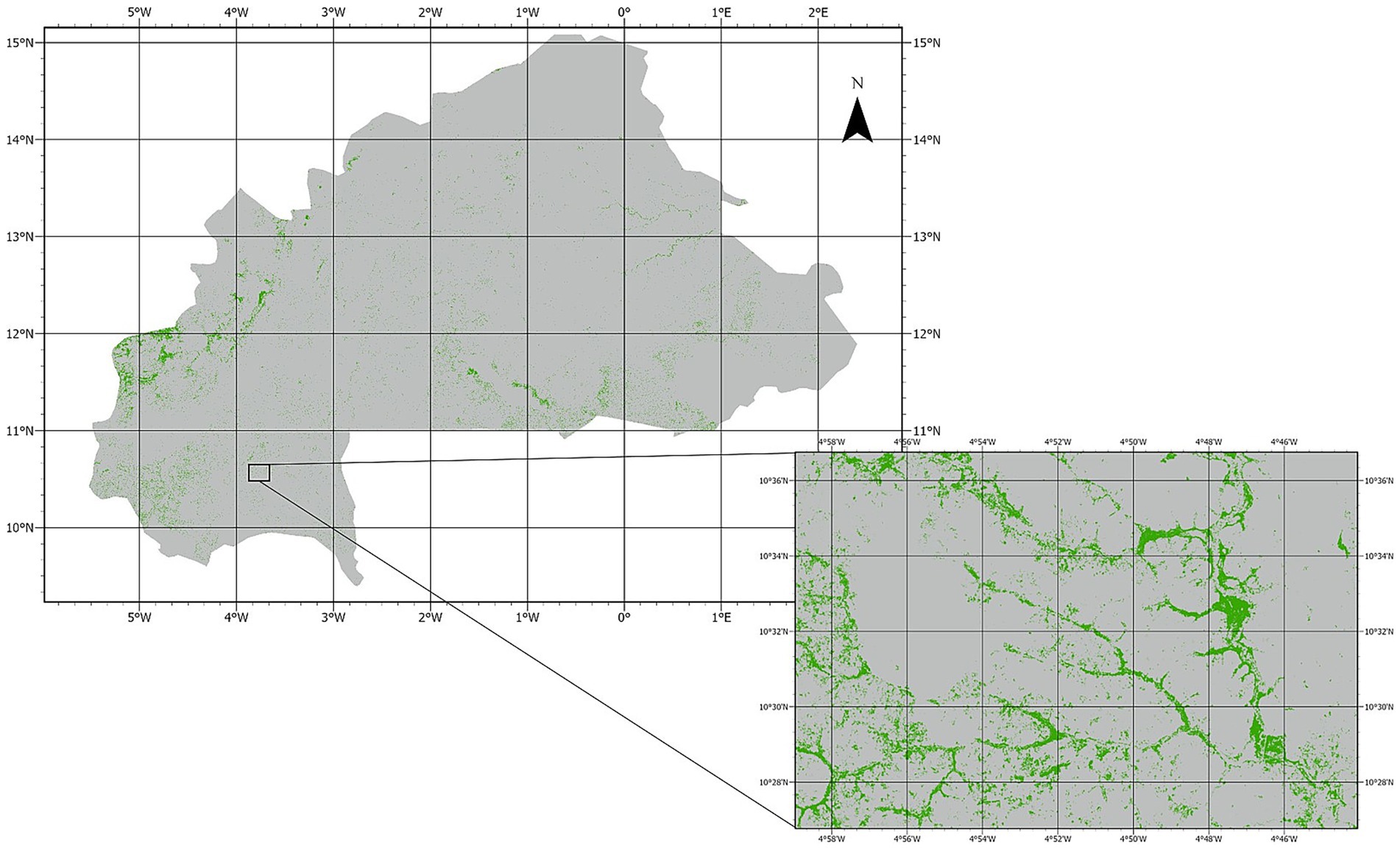 Figure 5. Distribution of the inland valleys in Burkina Faso. Inland valleys are regularly distributed over the whole country. The zooms show how the valleys meander.