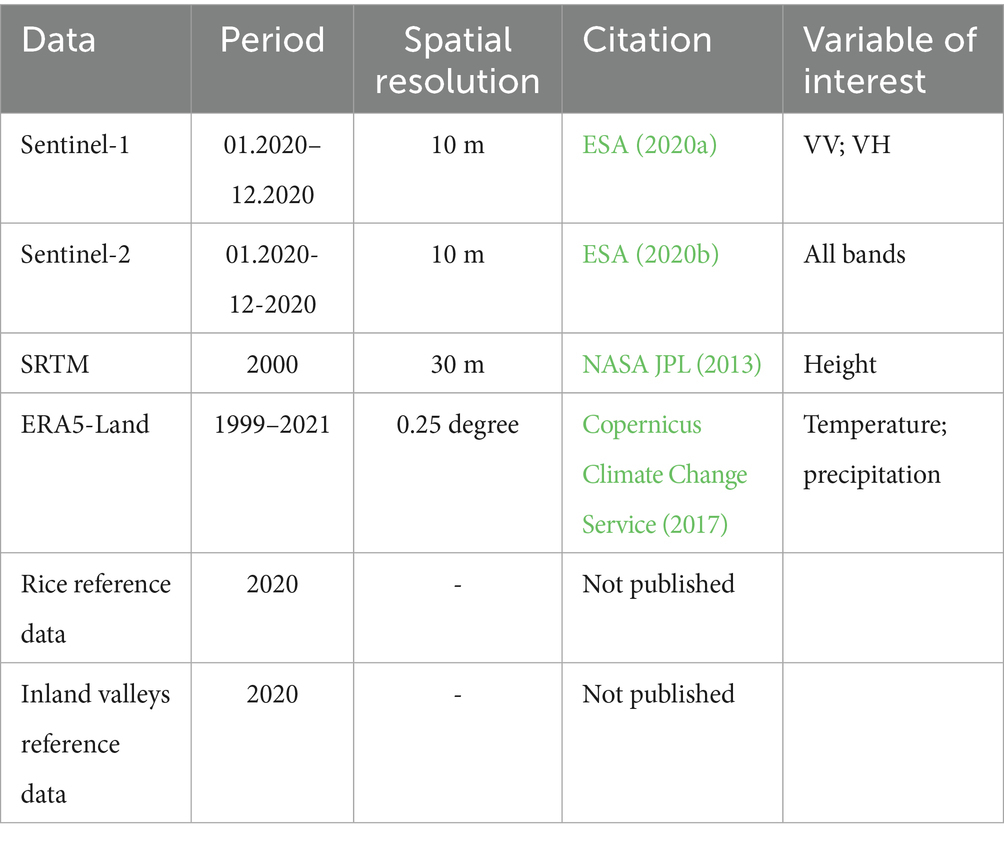 This study integrates Earth observation, climatic, and reference data to assess the suitability and current extent of rice cropping in Burkina Faso. An overview of the datasets used is provided in Table 1. In the following section we elaborate on each dataset and its role in the analysis. Sentinel-1 radar imagery (VV and VH polarization) from the year 2020 was used to capture the structural and phenological characteristics of rice fields, benefiting from its cloud-penetrating capability and consistent temporal coverage. Sentinel-2 data for the same period were used to compute vegetation indices such as NDVI, NDWI, and EVI. The 10 m spatial resolution is suitable for mapping smallholder agricultural fields common in the region. The SRTM elevation data at 30 m resolution were used to derive topographic variables including slope, flow accumulation, and topographic wetness index. As climatic data we used ERA5-Land from 1999 to 2021 to evaluate long-term climatic suitability for rice cropping. The dataset provides gridded estimates of key climate variables, including daily precipitation and temperature at a resolution of 0.25°. ERA5-Land was selected for this study due to its long temporal coverage (1999–2021), consistent reanalysis framework, and daily resolution of precipitation and temperature, which are necessary for deriving a long-term climatic suitability index.