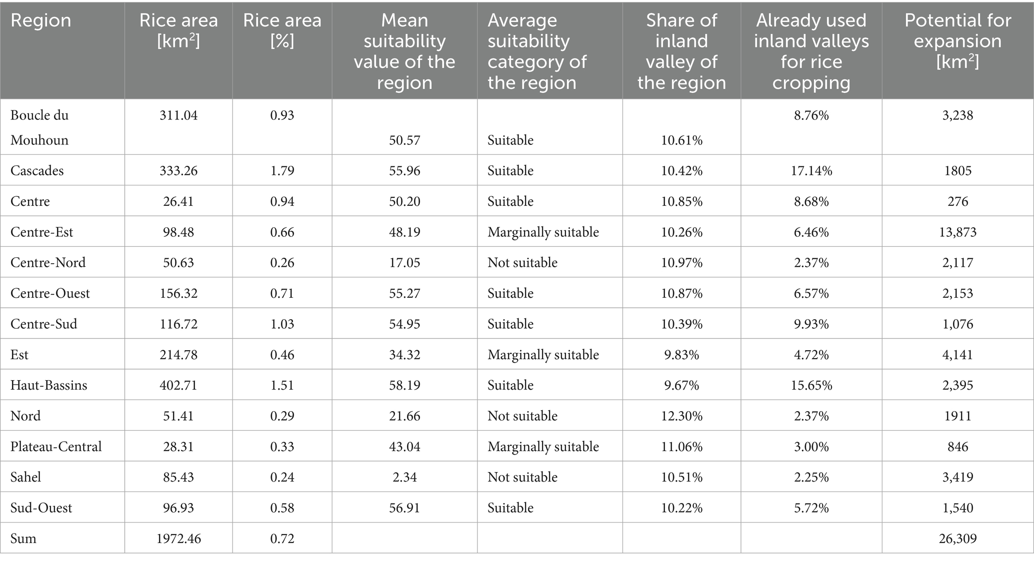 Table 2. Current used rice area in km2 and % of the country per region and the corresponding suitability value and inland valley.