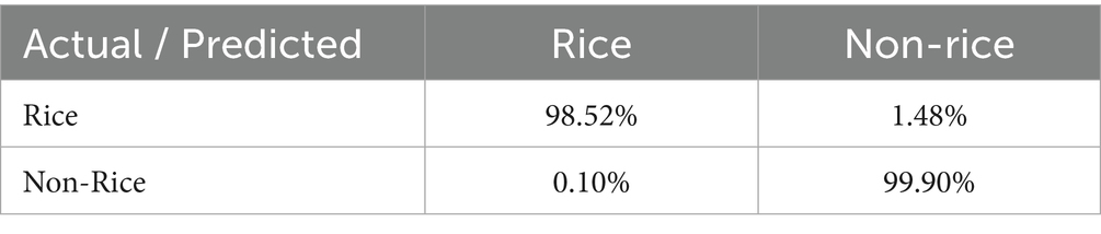 We performed a supervised classification to map rice and non-rice areas using a random forest model, a well-known machine-learning ensemble technique in the field of remote sensing (Belgiu and Drăguţ, 2016; Pal, 2005). We collected training data of rice and non-rice areas based on high resolution images from Google Earth supervised by local experts who are involved in rice cropping in inland valleys in Burkina Faso. In total 1,301 training areas of rice where collected, regularly distributed over the known rice cropping area of all of Burkina Faso. To provide a reliable differentiation between rice area and non-rice area also representative samples of non-rice areas were collected. A broad coverage of all other land uses needed to be considered, leading to a number of 1,646 reference areas for non-rice. A random forest classifier was trained using these samples—randomly split into 90% for training and 10% for validation. The accuracy assessment was thus performed across the entire study region, using spatially distributed samples from both rice and non-rice areas to evaluate the classifier’s generalizability and performance. We set up the model with 500 decision trees, to ensure an effective balance between accuracy and efficiency, each tree is trained on a different subset of training data, to reduce an overfitting of the model by ensuring that no single tree dominates the model (Belgiu and Drăguţ, 2016). At each split of the trees the algorithm randomly selects a subset of the spectral features to create partitions that best separates the classes rice vs. non-rice. The final prediction is the aggregated votes of all trees using a majority voting. After training, the classifier was applied to the composite images to generate a binary classification of rice and non-rice areas. To assess the performance of the classification model, we evaluated different standard accuracy metrics. Formulas can be found in Congalton and Green (2019). To exclude an agreement by chance between mapping result and validation data we calculated the Kappa coefficient, where 1 states an agreement beyond chance. To assess the proportion of all correctly classified samples independent of the class (rice/non-rice) we calculated the overall accuracy, where 1 means a perfect agreement of the validated samples. The producer’s accuracy (PA) of the class rice was calculated to assess the ability of the approach to correctly classify the validation areas of rice. Additionally, the user’s accuracy (UA) was calculated for the class rice, to estimate the probability that a given location of rice in the map is correctly classified.