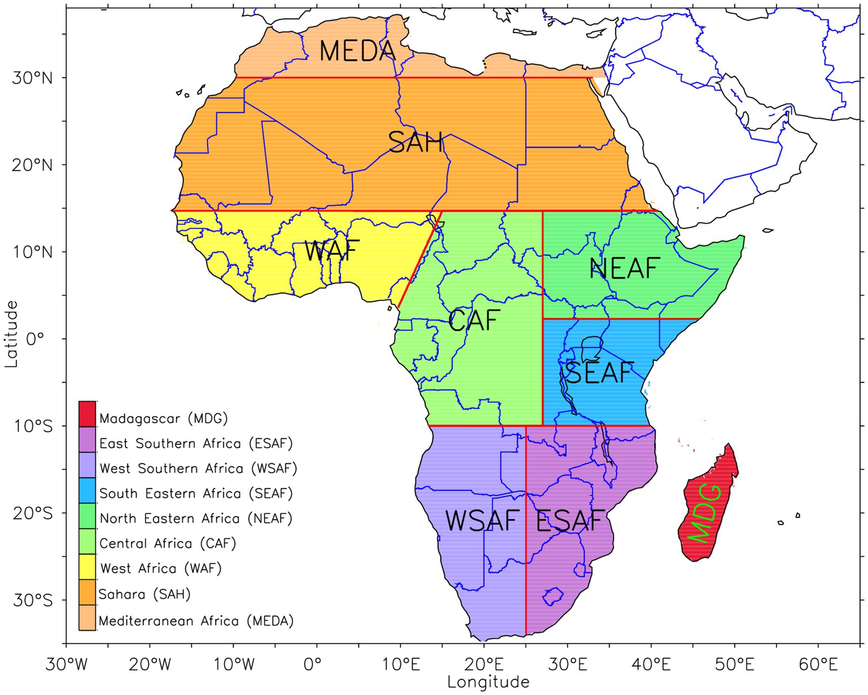 Figure 1. Africa’s domain showing the IPCC AR6 climate reference regions (red line) for Africa used in this Study: Mediterranean Africa (MEDA), Sahara (SAH), West Africa (WAF), Central Africa (CAF), North Eastern Africa (NEAF), South Eastern Africa (SEAF), West Southern Africa (WSAF), East Southern Africa (ESAF), and Madagascar (MAD).
