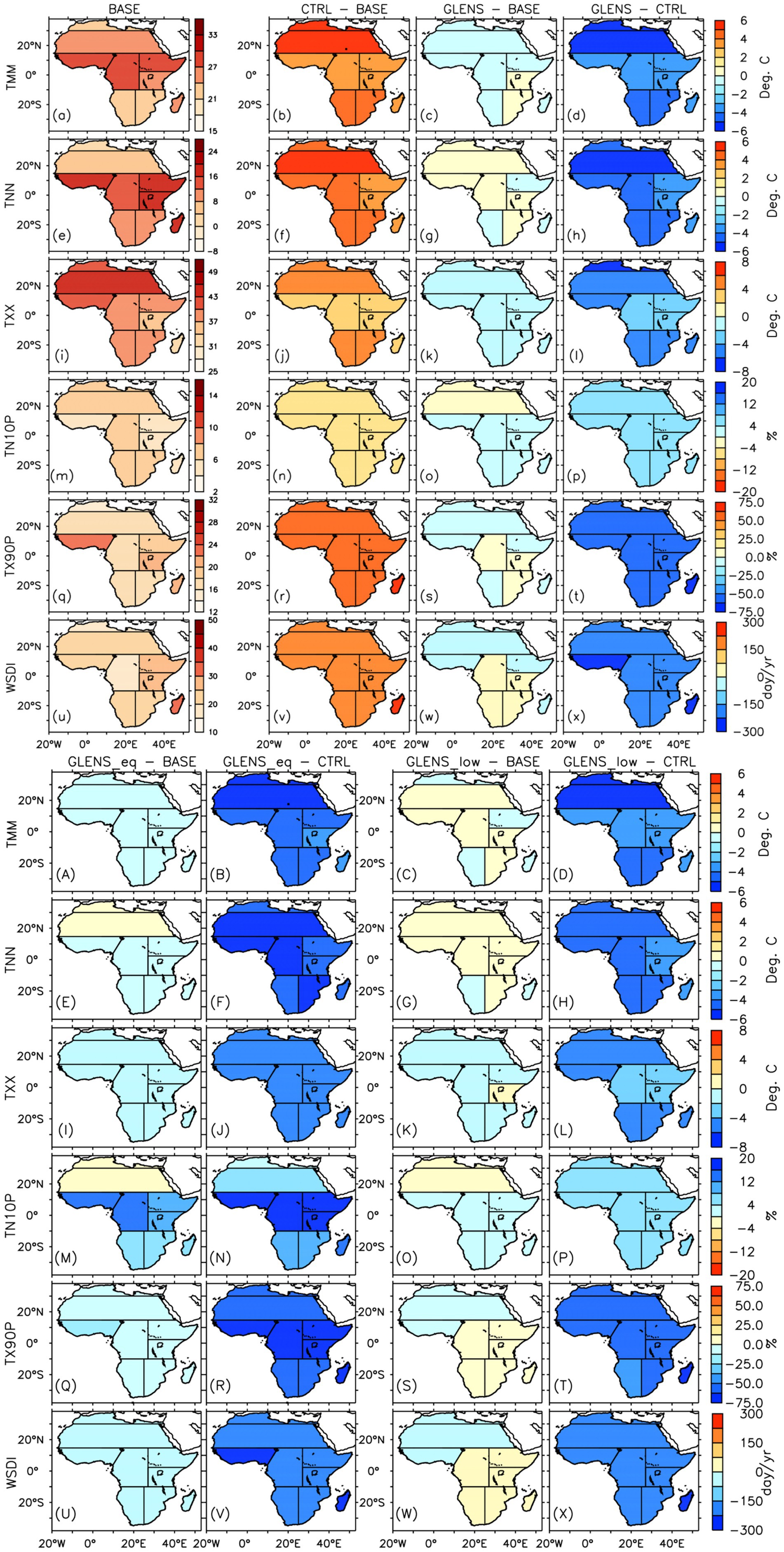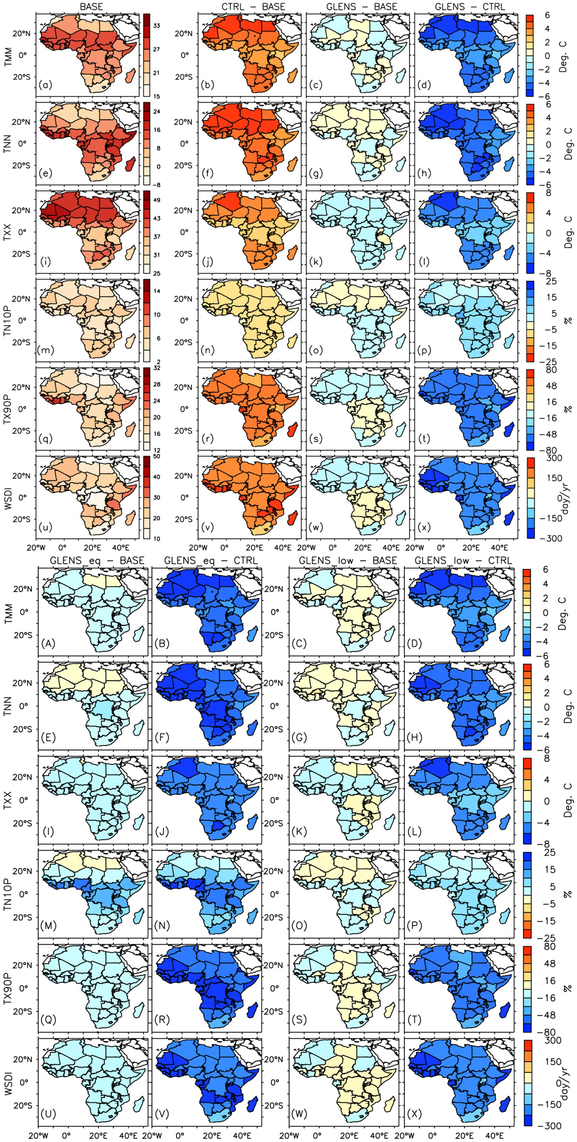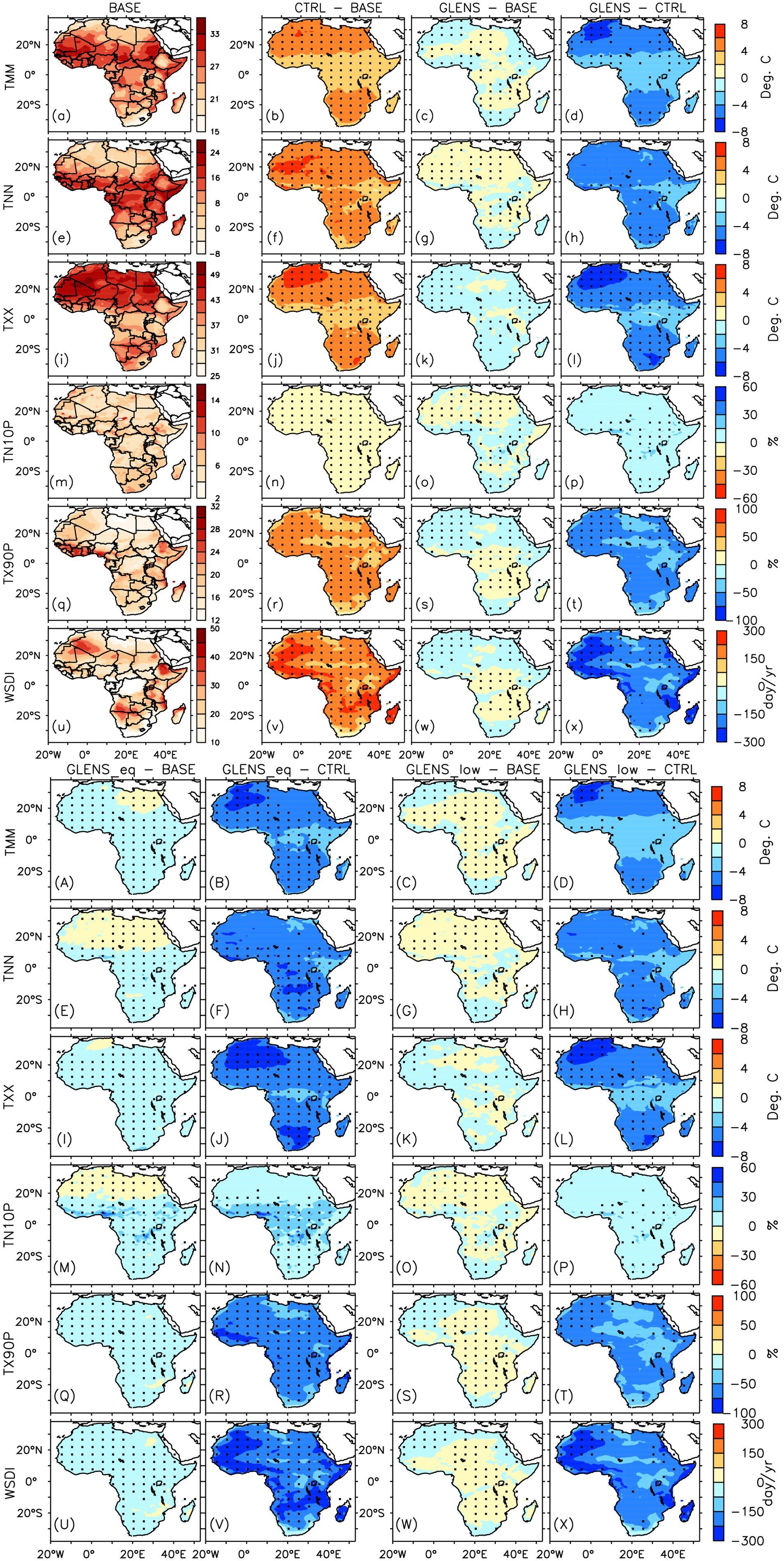 Figure 2. Mean annual spatial distribution of (a–x and A–X) mean and extreme temperature indices over Africa for the baseline period (or BASE: 2010–2030) and their projected changes in the future (2075-2095) under the RCP8.5 scenario without SAI (CTRL–BASE) and with SAI (GLENS – BASE, GLENS_eq–BASE, and GLENS_low–BASE). How each SAI experiment could influence the impacts of global warming on mean and extreme temperature indices in the future is represented in GLENS–CTRL, GLENS_eq–CTRL, and GLENS_low–CTRL. The points ‘.’ Indicate where at least 80% (16 out of 20 members) of the simulations used to calculate CTRL–BASE and GLENS – BASE, and all (3 out of 3 members) used in calculating GLENS_eq–BASE and GLENS_low–BASE, agree on the sign of the changes. On the other hand, the points ‘.’ On GLENS–CTRL, GLENS_eq–CTRL, and GLENS_low–CTRL indicate where SAI is over-effective in compensating for the influence of global warming relative to the baseline (BASE).