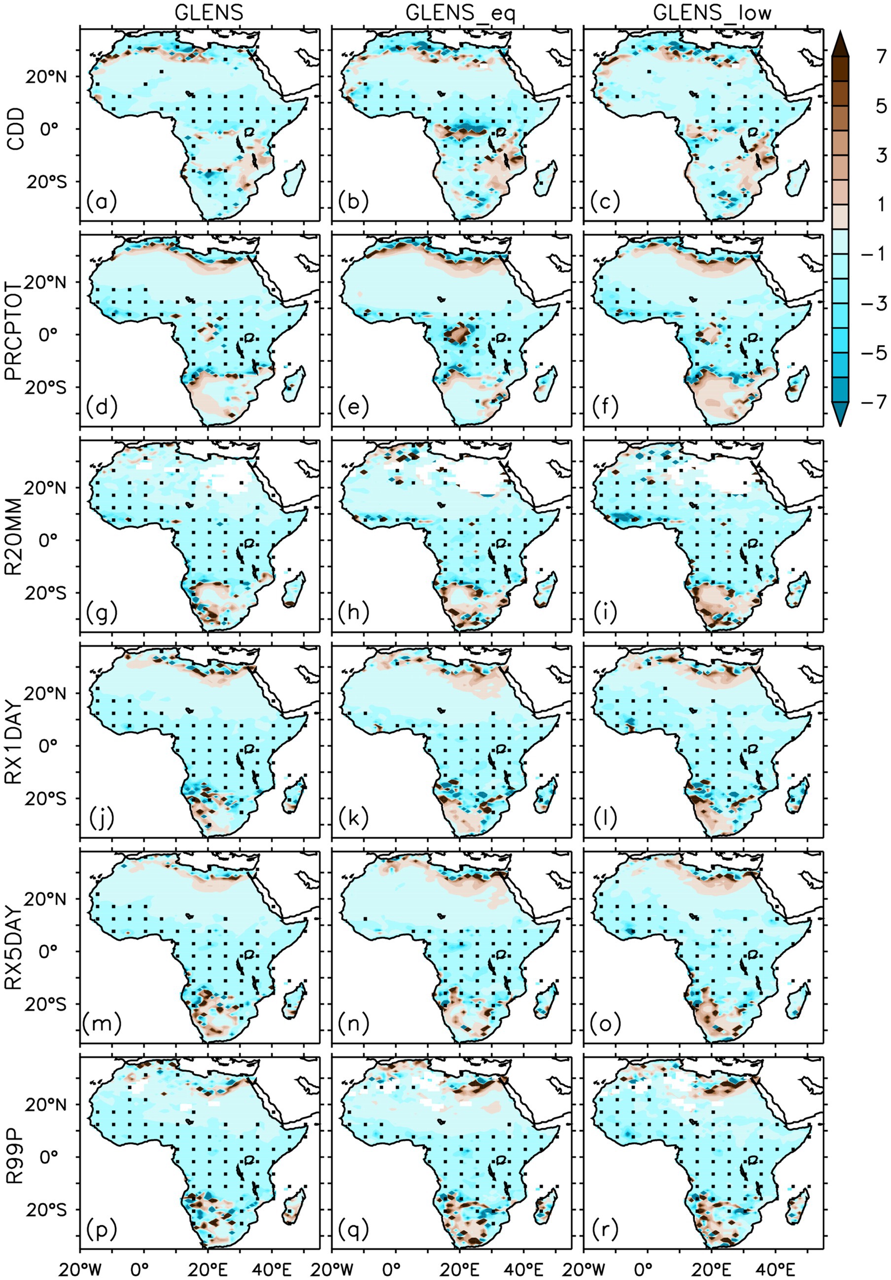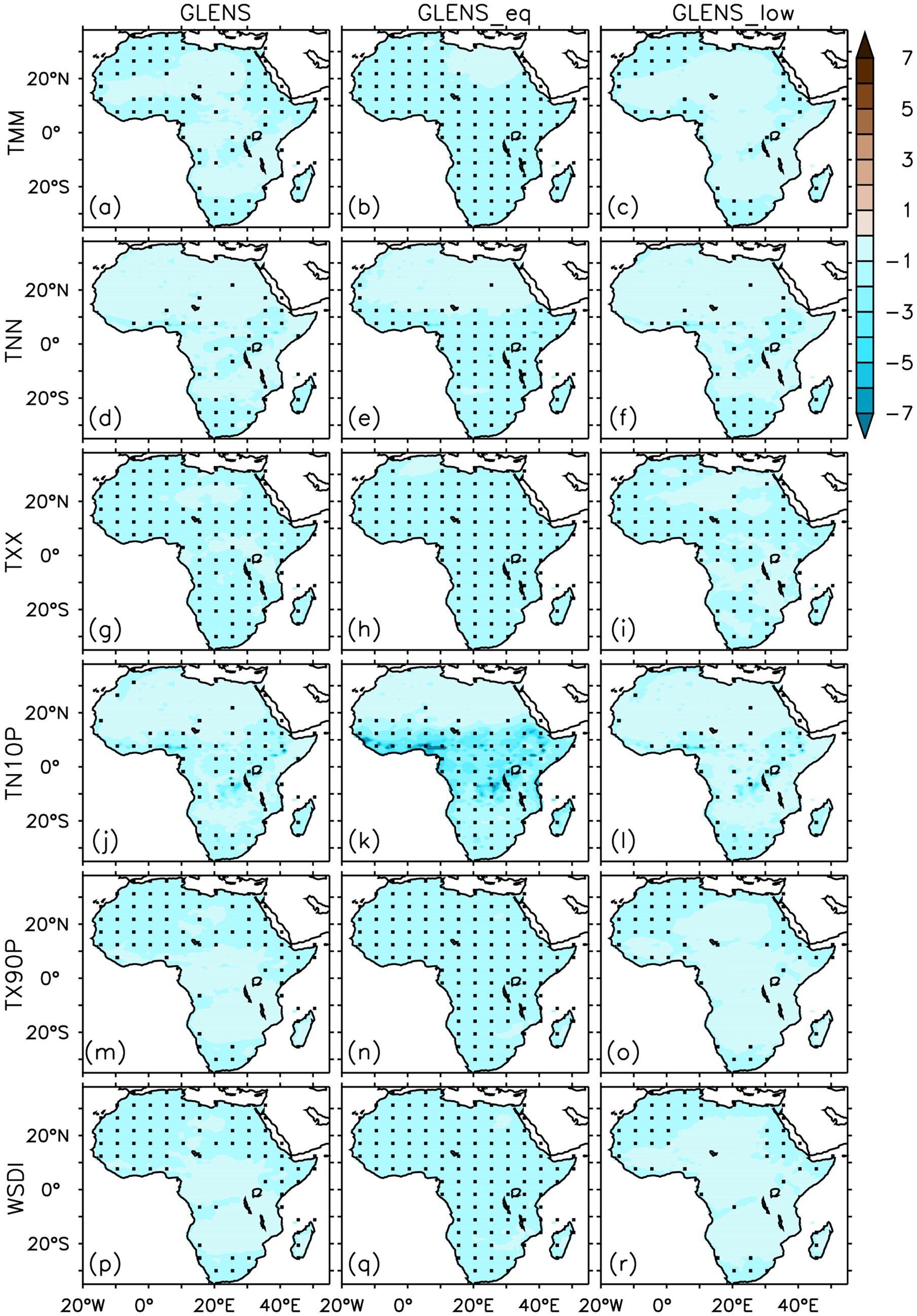 We then quantified how the characteristics of temperature and precipitation indices might change in the future, towards the end of the century (2075–2095) across Africa under (i) the RCP8.5 scenario without any SAI experiment relative to 2010–2030 or the baseline (CTRL minus BASE) and under (ii) RCP8.5 scenario with SAI experiments relative to the baseline (GLENS minus BASE, GLENS_eq minus BASE, and GLENS_low minus BASE), and (iii) the impact of SAI on GHG-induced warming under RCP8.5 scenario (GLENS minus CTRL, GLENS_eq minus CTRL, and GLENS_low minus CTRL).