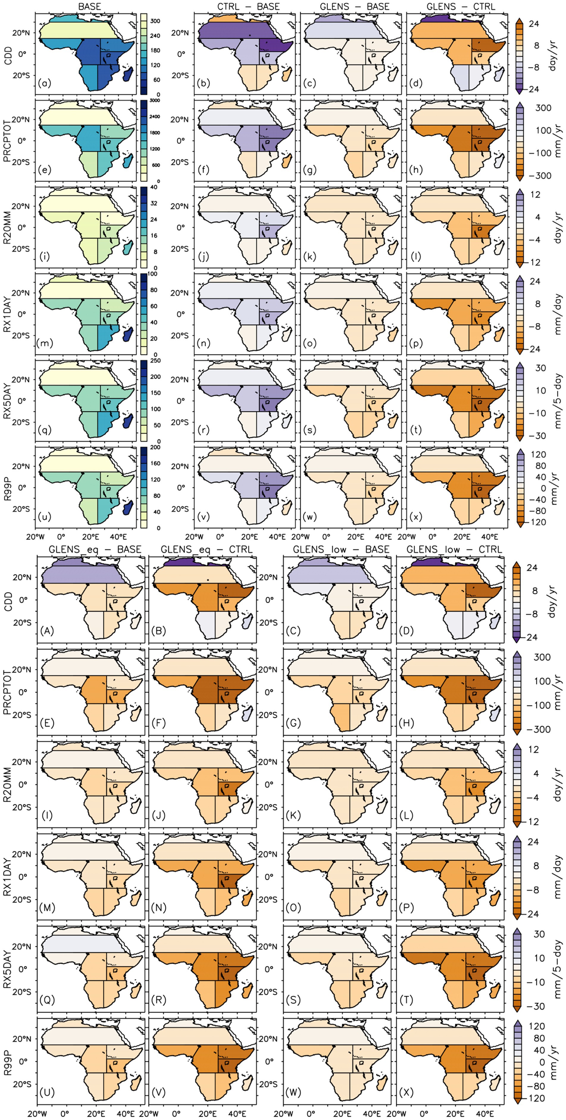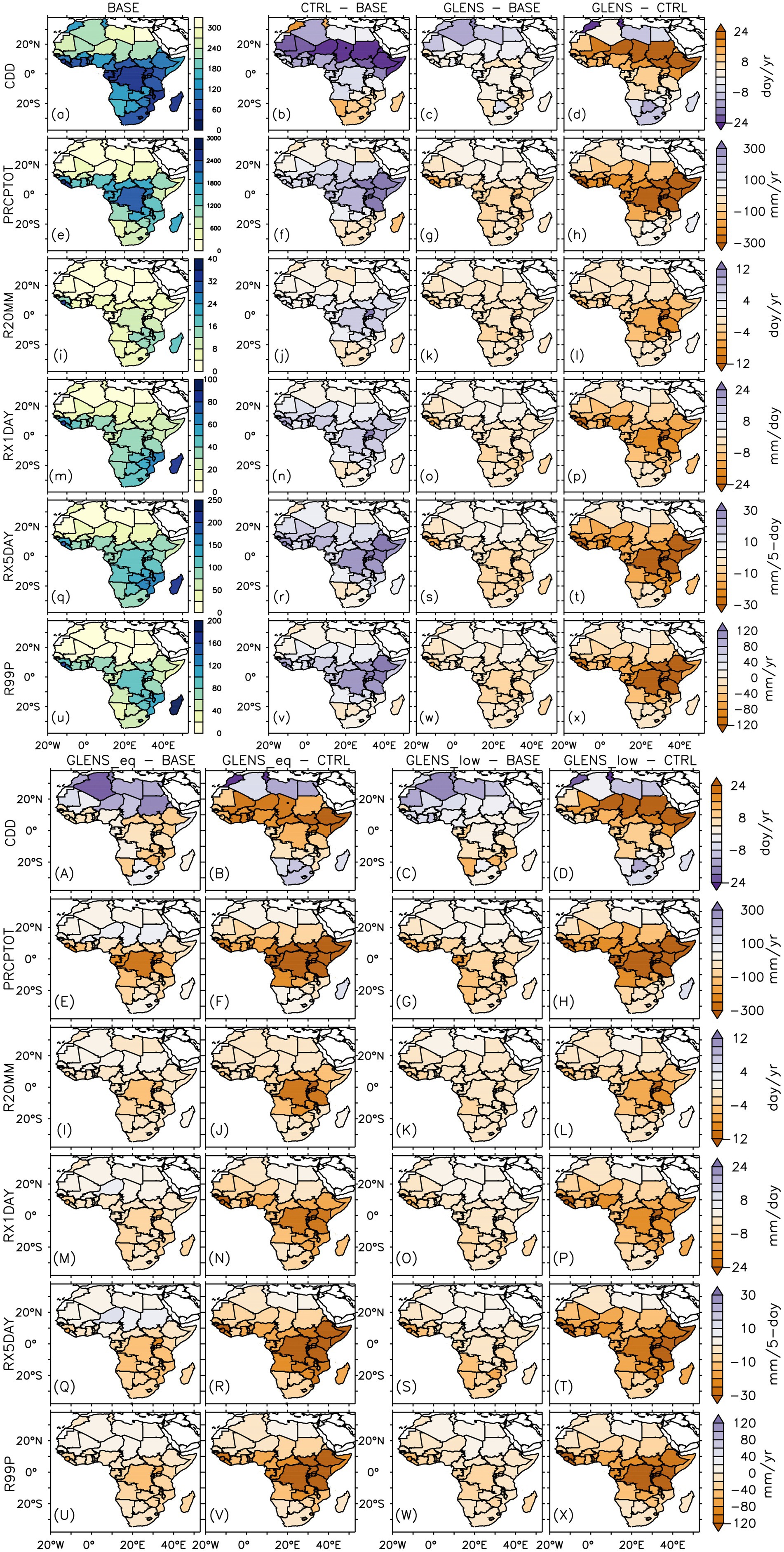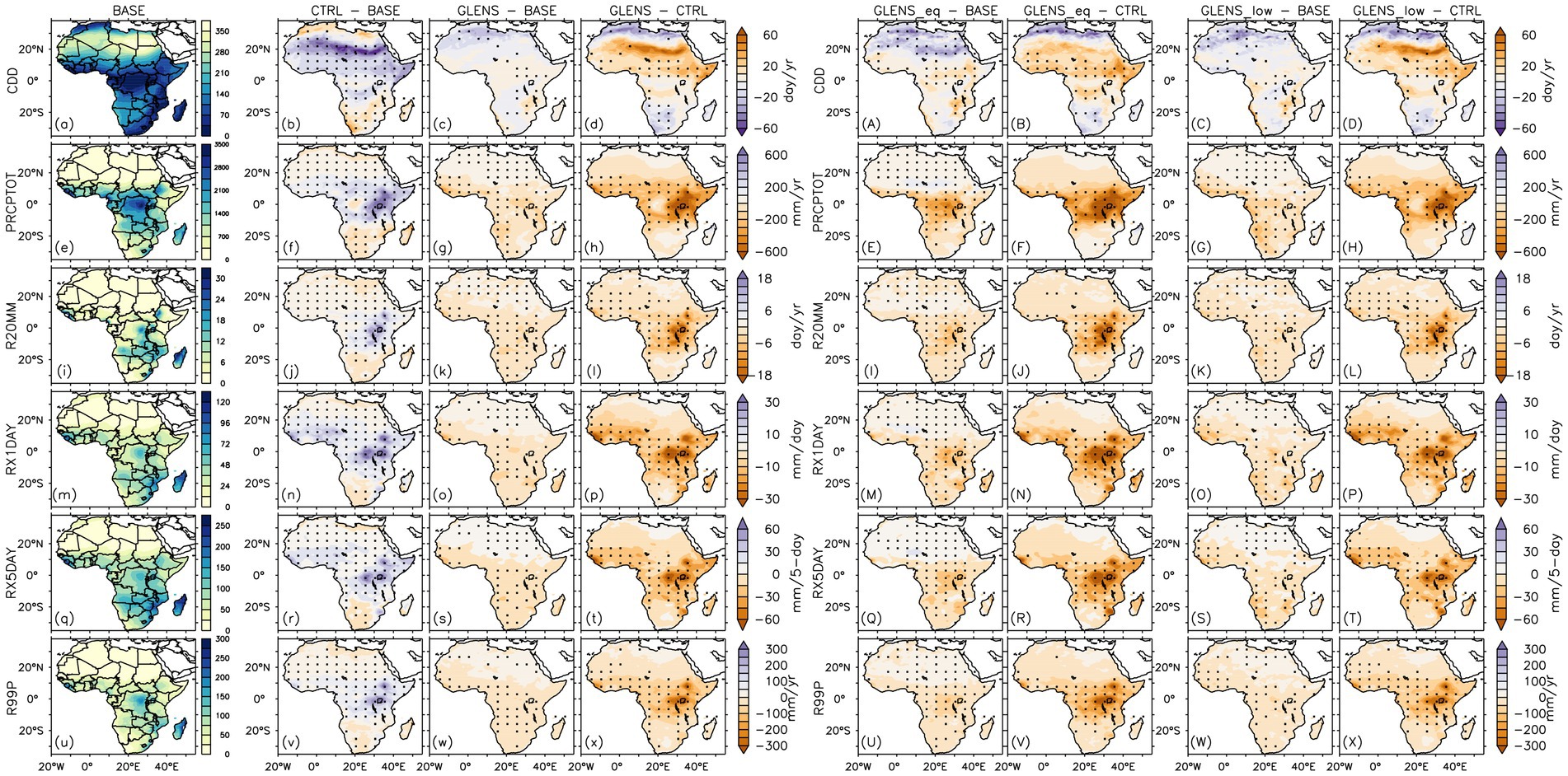 Figure 4. Mean annual spatial distribution of (a-x and A-X) mean and extreme precipitation indices over Africa for the baseline period (or BASE: 2010 -2030) and their projected changes in the future (2075–2095) under the RCP8.5 scenario without SAI (CTRL–BASE) and with SAI (GLENS – BASE, GLENS_eq–BASE, and GLENS_low–BASE). How each SAI experiment could influence the impacts of global warming on mean and extreme temperature indices in the future is represented in GLENS–CTRL, GLENS_eq–CTRL, and GLENS_low–CTRL. The points `.’ Indicate where at least 80% (16 out of 20 members) of the simulations used to calculate CTRL–BASE and GLENS – BASE, and all (3 out of 3 members) used in calculating GLENS_eq–BASE and GLENS_low -BASE, agree on the sign of the changes. On the other hand, the points`.’ On GLENS–CTRL, GLENS_eq–CTRL, and GLENS_low–CTRL indicate where SAI is over-effective in compensating for the influence of global warming relative to the baseline (BASE).