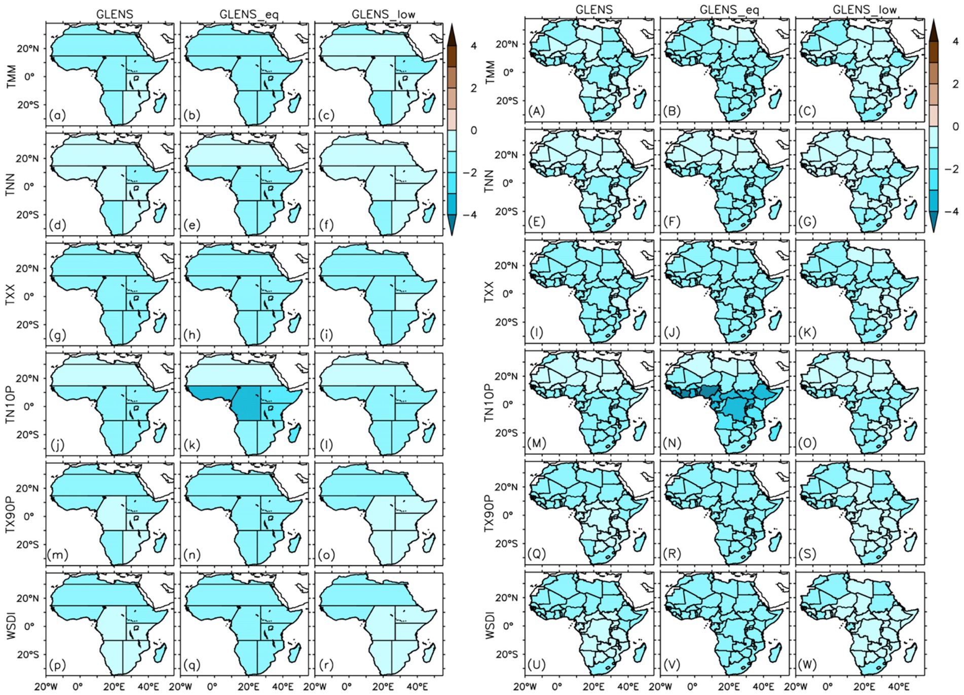Figure 8. Mean efficacy of SAI experiments to compensate for the influence of global warming relative to the baseline (BASE) over (a–r) Africa’s climatic zones and (A–R) African countries for mean and extreme temperature indices.