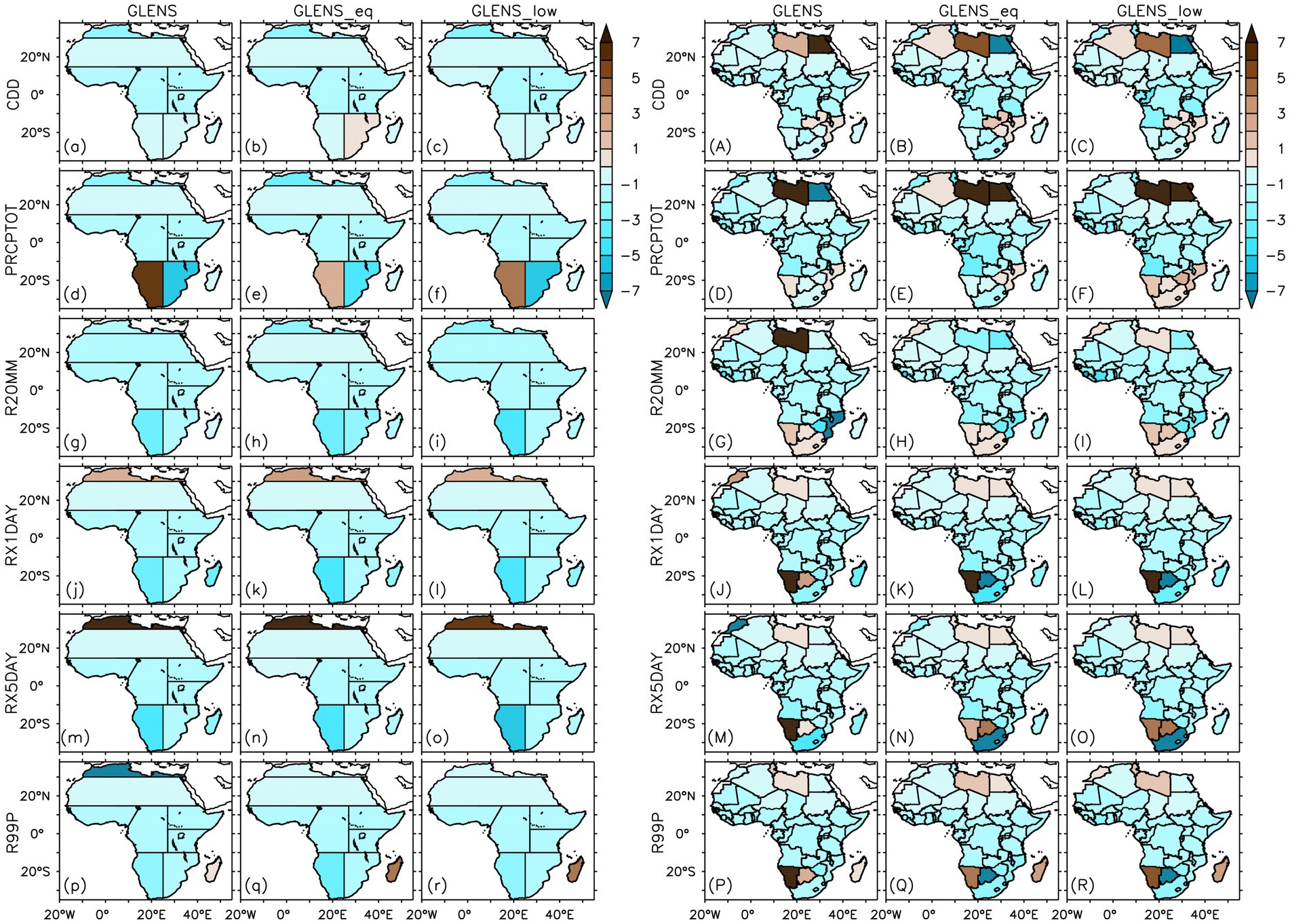 Figure 11. Mean efficacy of SAI experiments to compensate for the influence of global warming relative to the baseline (BASE) over (a–r) Africa’s climatic zones and (A–R) African countries for mean and extreme precipitation indices.