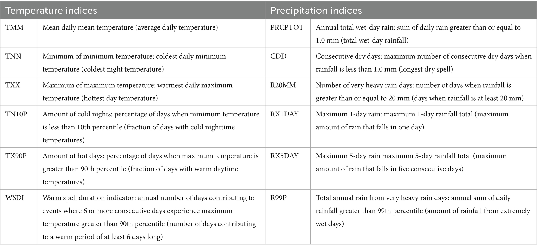 Table 1. A list of the selected ETCCDI mean and extreme temperature and precipitation indices analysed in this study.