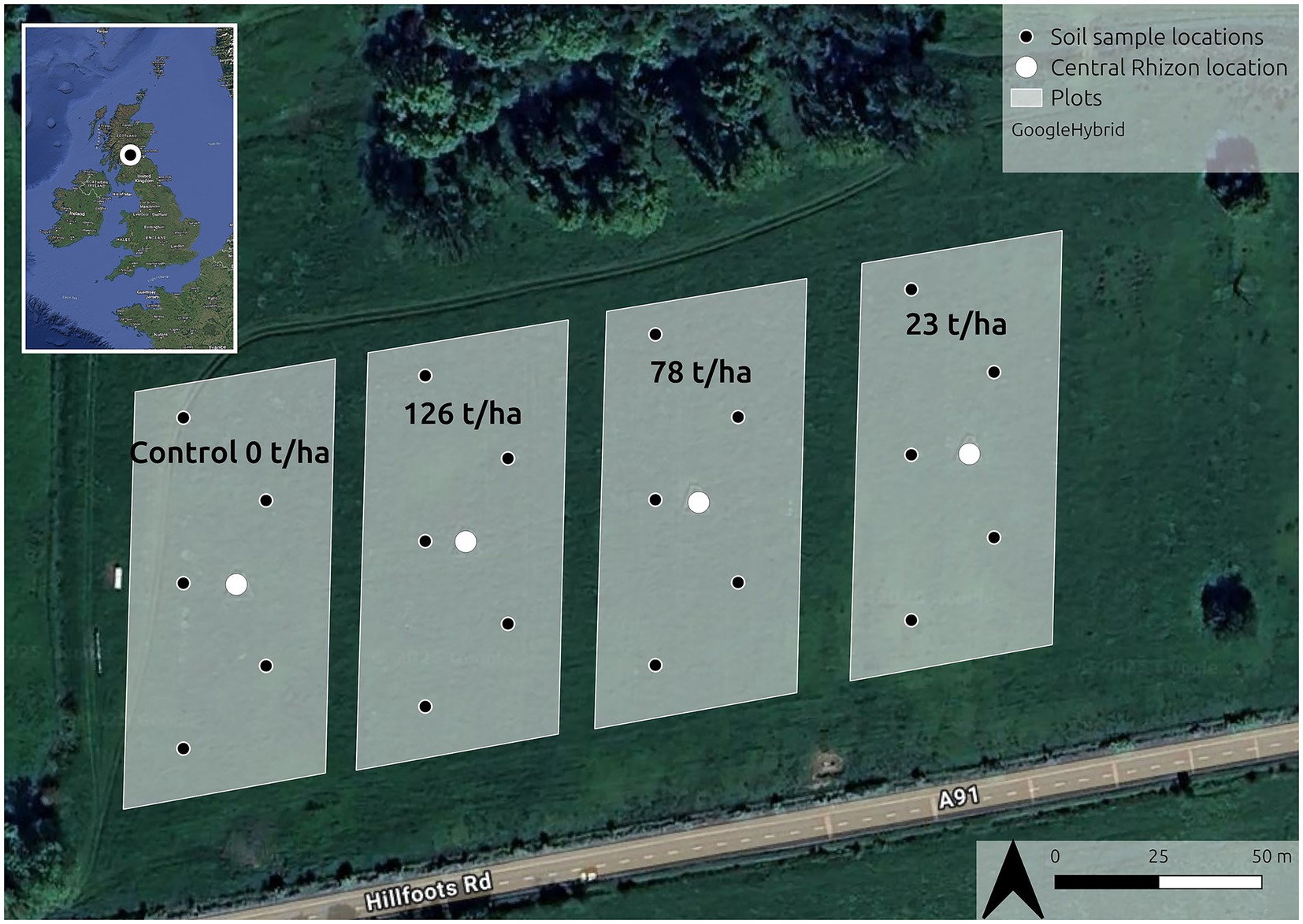 Figure 1. Overview of field trial layout with four c. half hectare plots. White circles indicate the location of the central soil pits in which rhizon samplers are installed in three separate pits. Black/white circles indicate the location of the soil samples. Background image and inset map image are GoogleHybrid with the WHS-84 coordinate reference system.